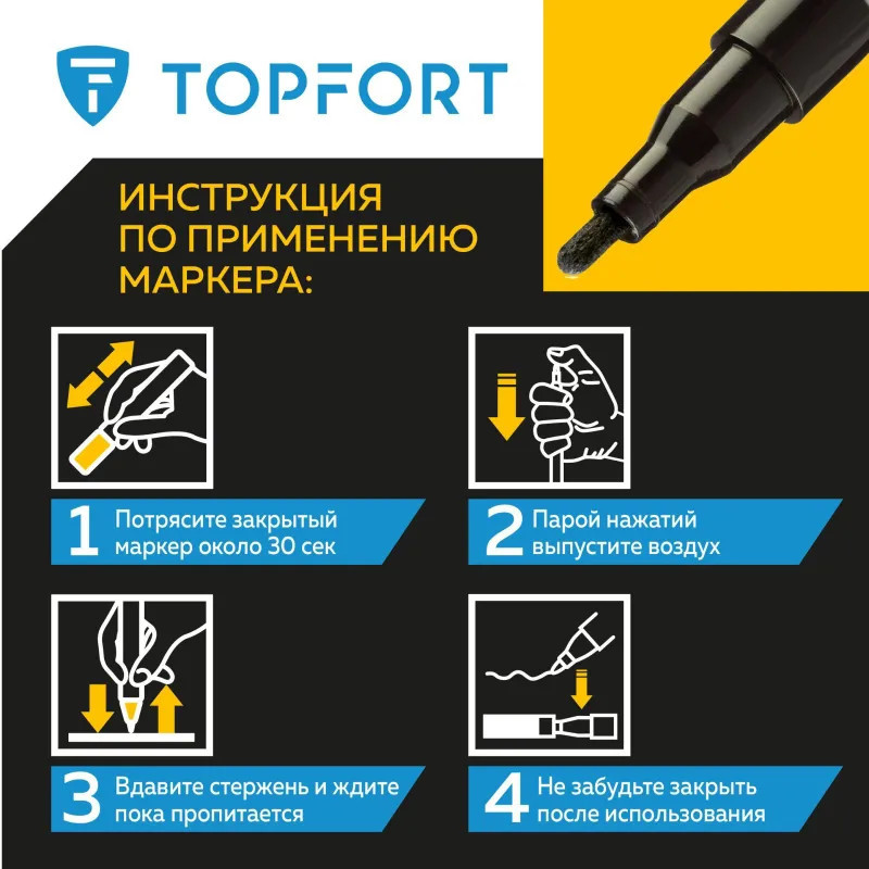 Предостережения: плотно закрывайте колпачок после применения, держать маркер вдали от источников тепла и воспламенения.