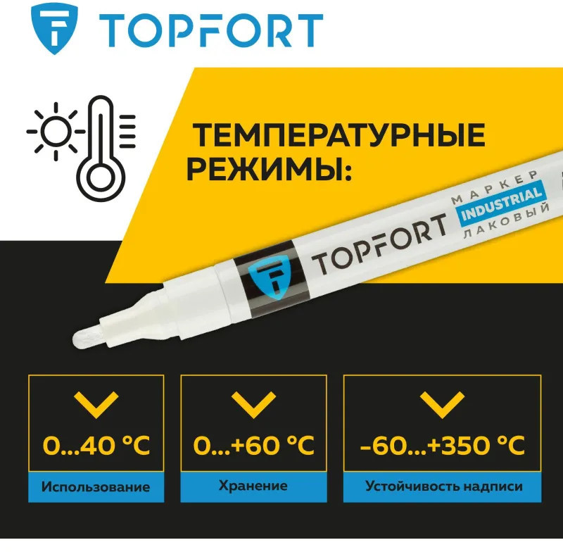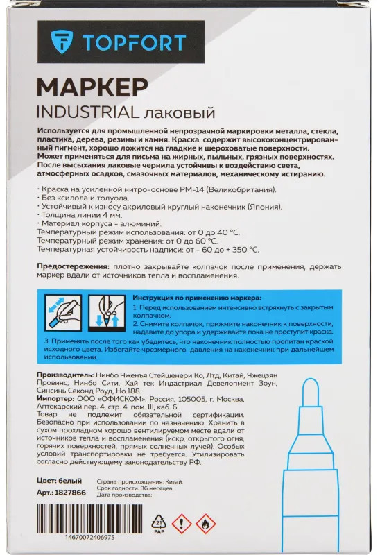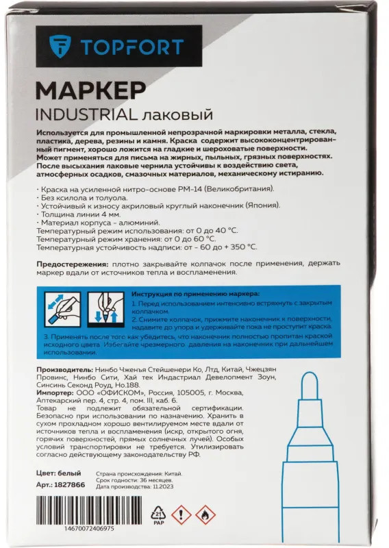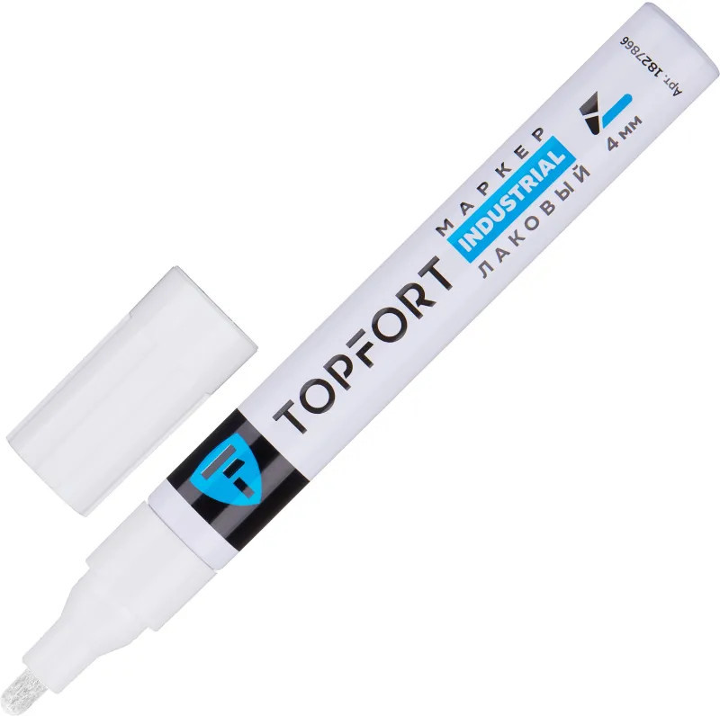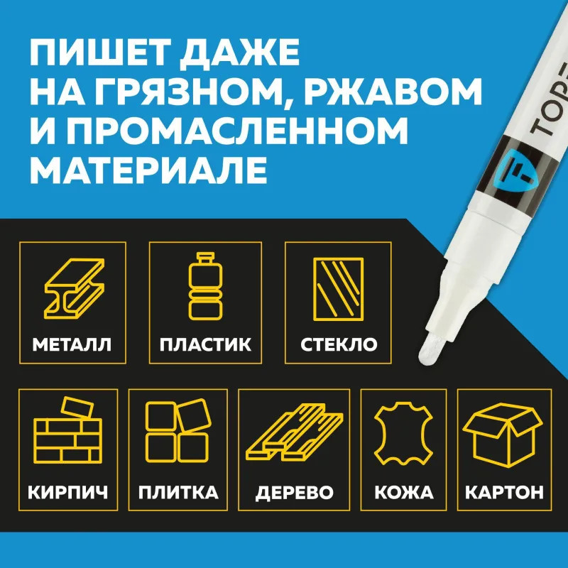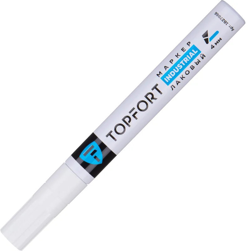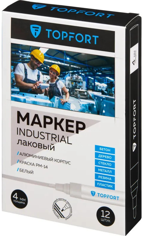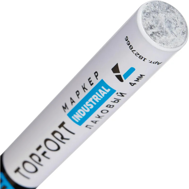 Маркер промышленный Topfort Industrial для универсальной маркировки белый (4 мм) предназначен для промышленной непрозрачной маркировки металла, стекла, пластика, дерева, резины, камня, картона, кирпича, текстиля, кожи (материал), бумаги, бетона. Краска содержит высококонцентрированный пигмент, хорошо ложится на гладкие и шероховатые поверхности. Может применяться для письма на жирных, пыльных, грязных поверхностях. После высыхания лаковые чернила устойчивы к воздействию света, атмосферных осадков, смазочных материалов, механическому истиранию. Создает стойкую линию толщиной 2 мм. Длина маркера — 130 мм. Цвет чернил: белый.