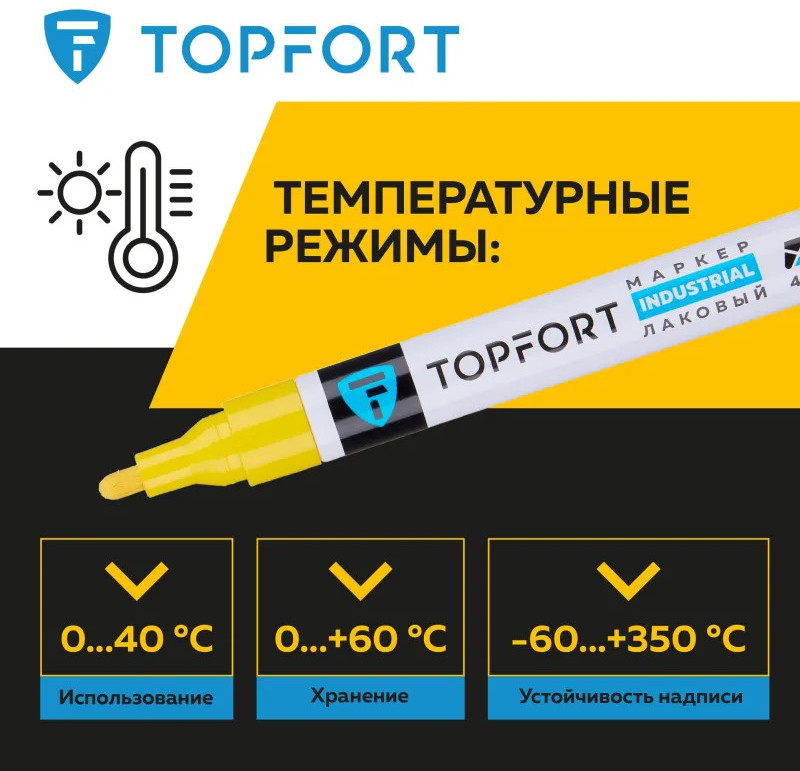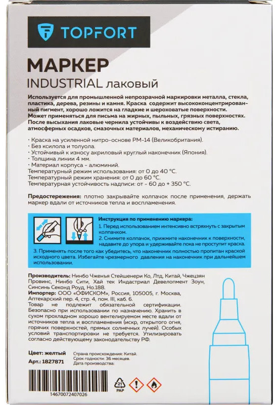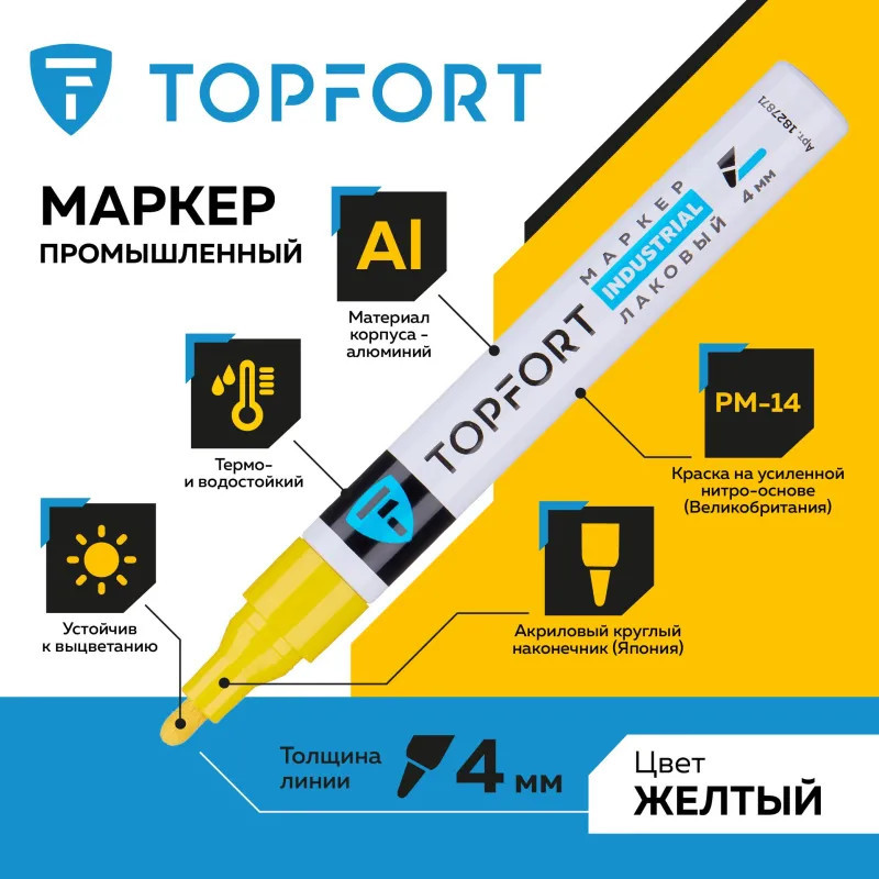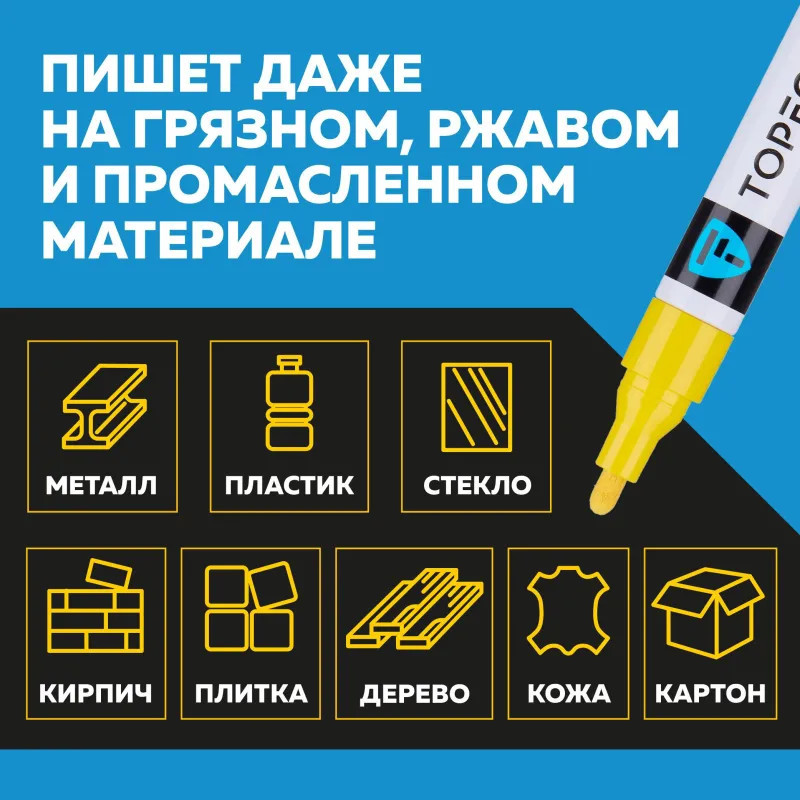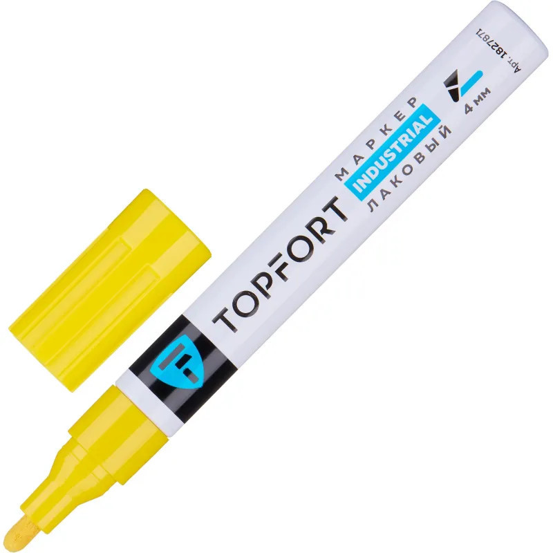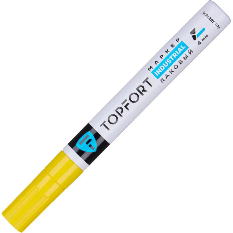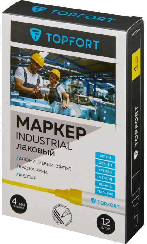 Маркер промышленный Topfort Industrial для универсальной маркировки желтый (4 мм) предназначен для промышленной непрозрачной маркировки металла, стекла, пластика, дерева, резины, камня, картона, кирпича, текстиля, кожи (материал), бумаги, бетона. Краска содержит высококонцентрированный пигмент, хорошо ложится на гладкие и шероховатые поверхности. Может применяться для письма на жирных, пыльных, грязных поверхностях. После высыхания лаковые чернила устойчивы к воздействию света, атмосферных осадков, смазочных материалов, механическому истиранию. Создает стойкую линию толщиной 2 мм. Длина маркера — 130 мм. Цвет чернил: желтый.