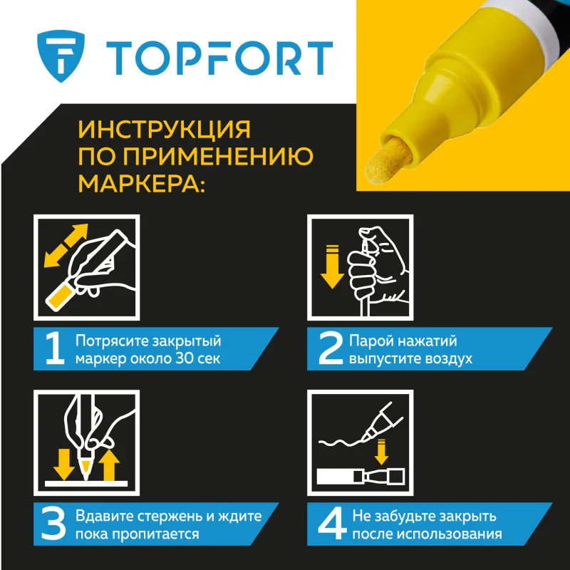 Предостережения: плотно закрывайте колпачок после применения, держать маркер вдали от источников тепла и воспламенения.