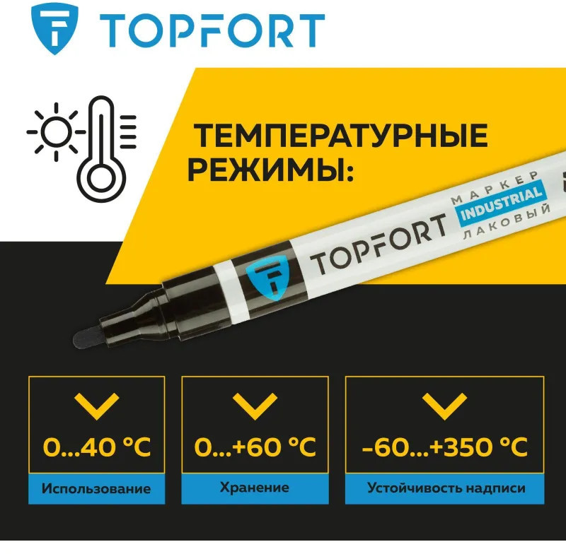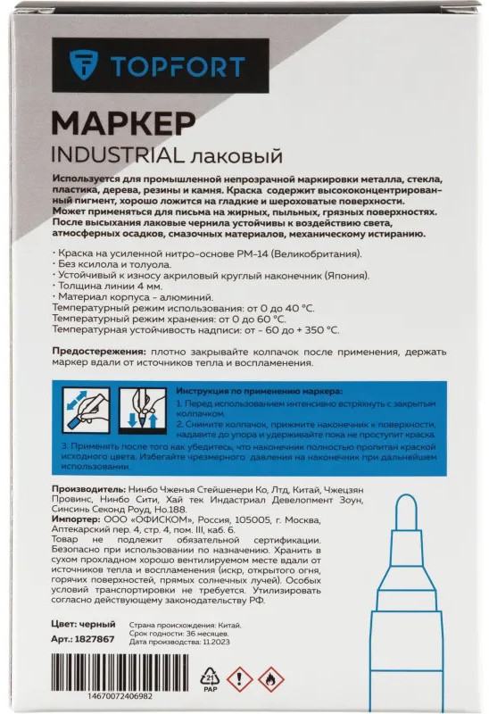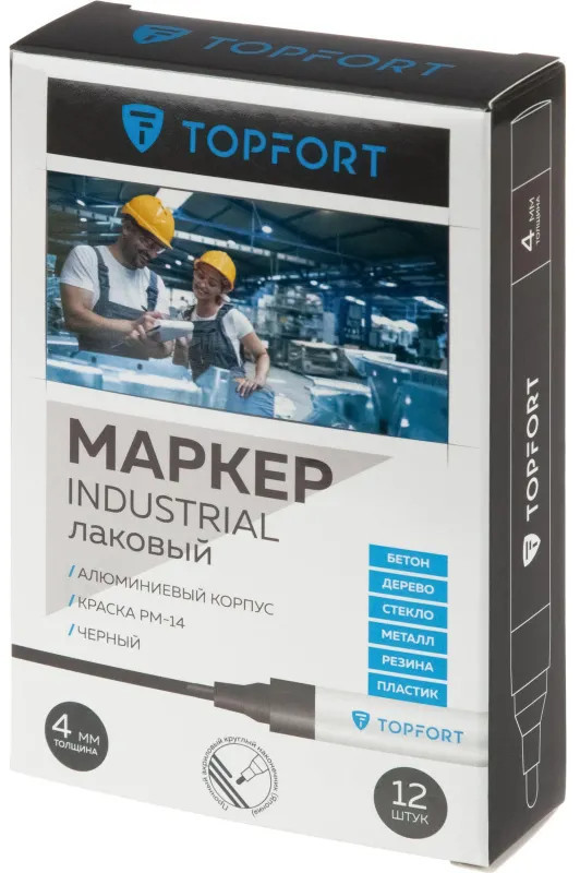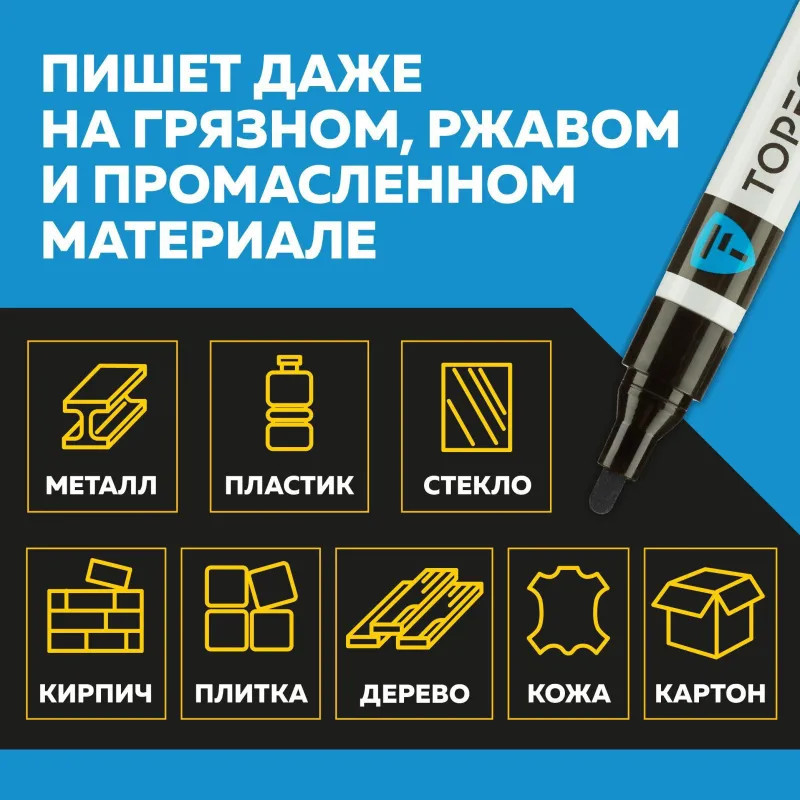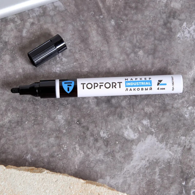 Маркер промышленный Topfort Industrial для универсальной маркировки черный (4 мм) предназначен для промышленной непрозрачной маркировки металла, стекла, пластика, дерева, резины, камня, картона, кирпича, текстиля, кожи (материал), бумаги, бетона. Краска содержит высококонцентрированный пигмент, хорошо ложится на гладкие и шероховатые поверхности. Может применяться для письма на жирных, пыльных, грязных поверхностях. После высыхания лаковые чернила устойчивы к воздействию света, атмосферных осадков, смазочных материалов, механическому истиранию. Создает стойкую линию толщиной 2 мм. Длина маркера — 130 мм. Цвет чернил: черный.