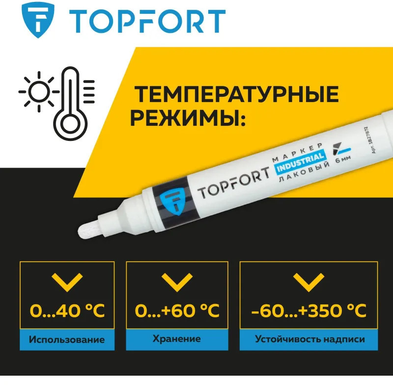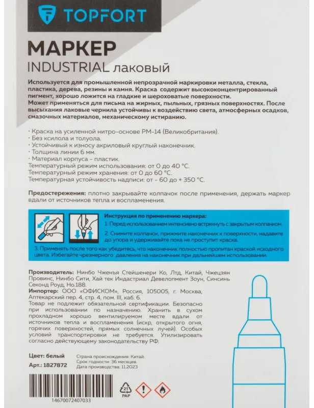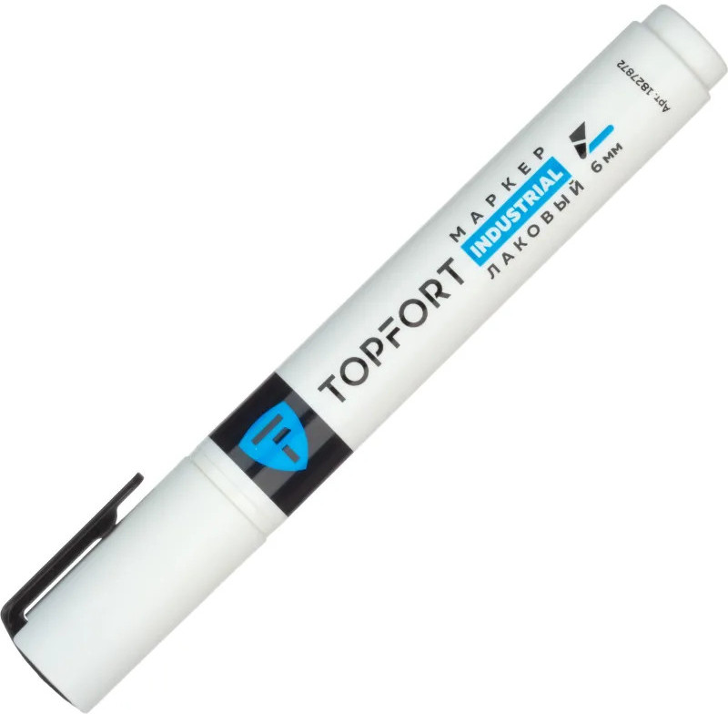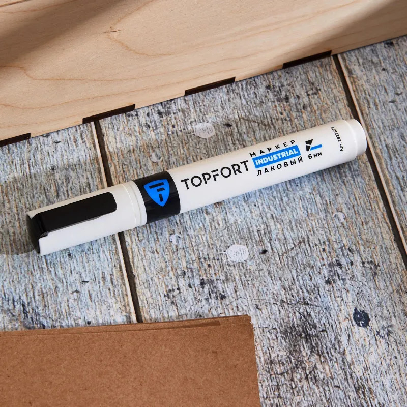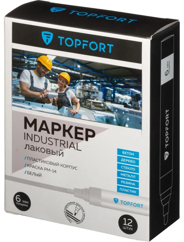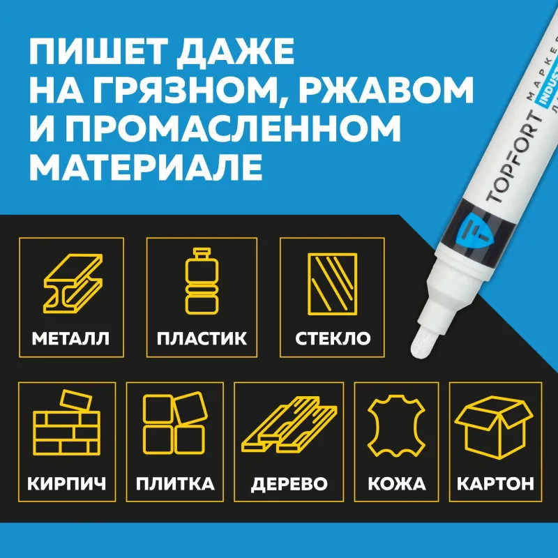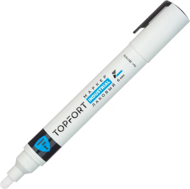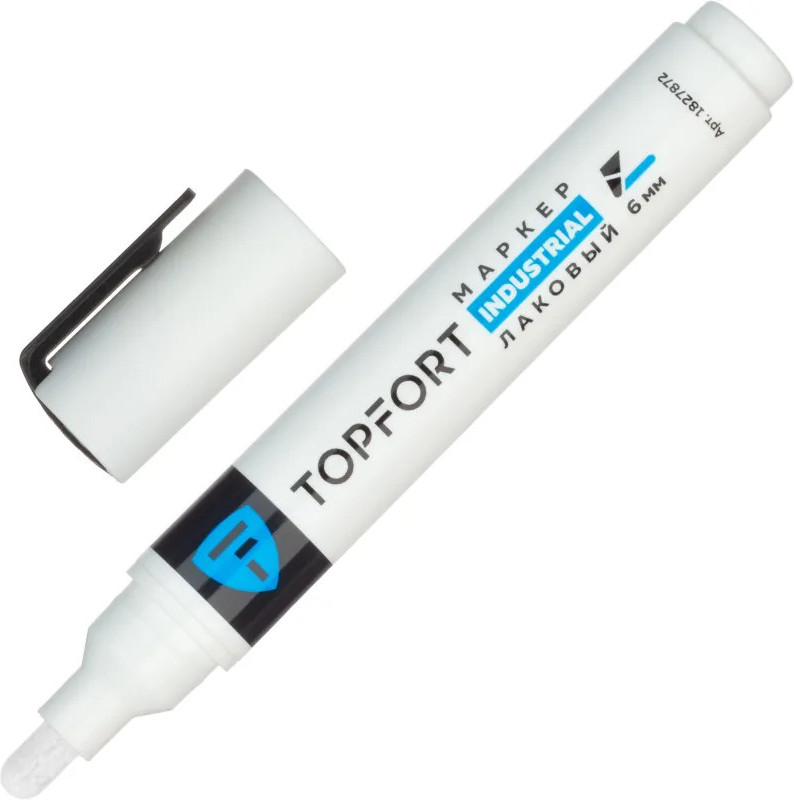 Маркер промышленный Topfort Industrial для универсальной маркировки белый (6 мм) предназначен для промышленной непрозрачной маркировки металла, стекла, пластика, дерева, резины, камня, картона, кирпича, текстиля, кожи (материал), бумаги, бетона. Краска содержит высококонцентрированный пигмент, хорошо ложится на гладкие и шероховатые поверхности. Может применяться для письма на жирных, пыльных, грязных поверхностях. После высыхания лаковые чернила устойчивы к воздействию света, атмосферных осадков, смазочных материалов, механическому истиранию. Создает стойкую линию толщиной 2 мм. Длина маркера — 130 мм. Цвет чернил: белый.