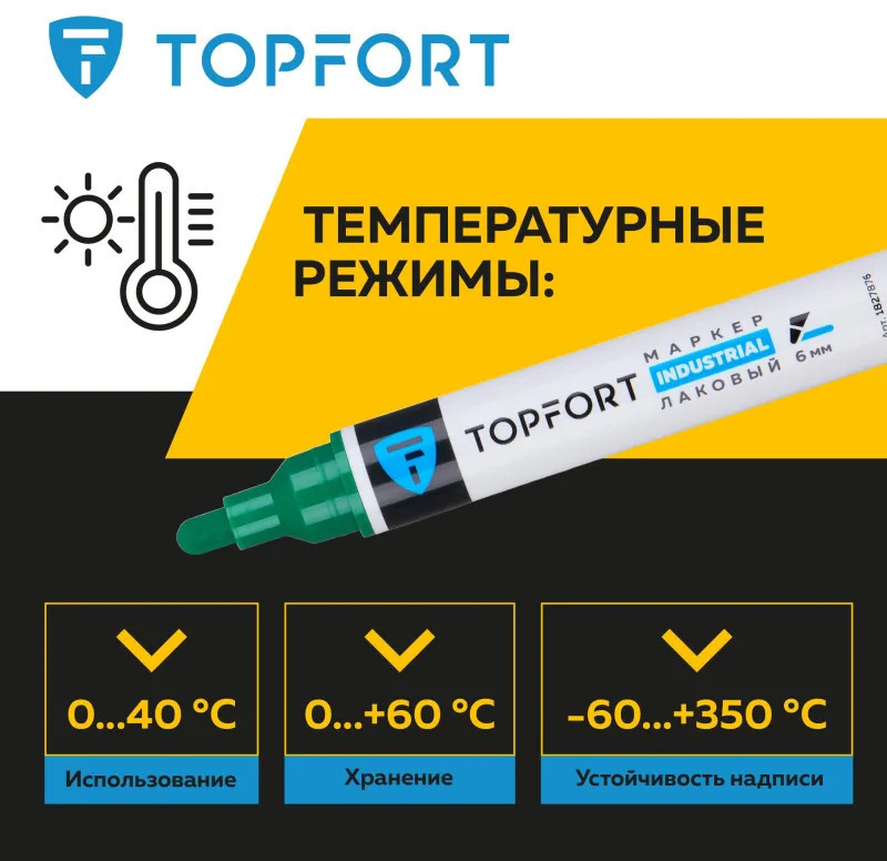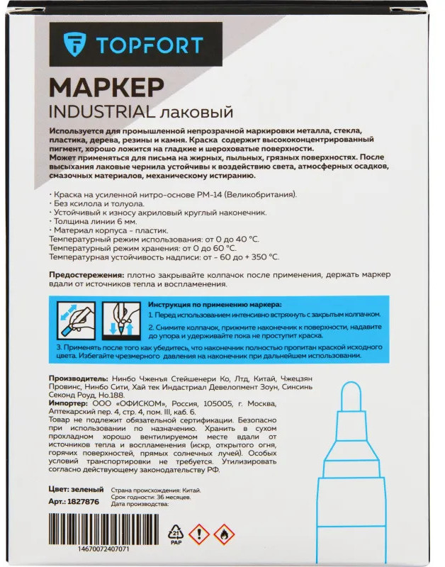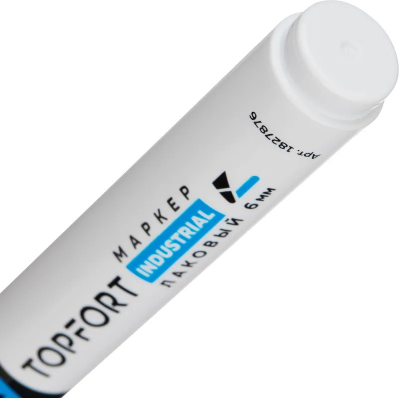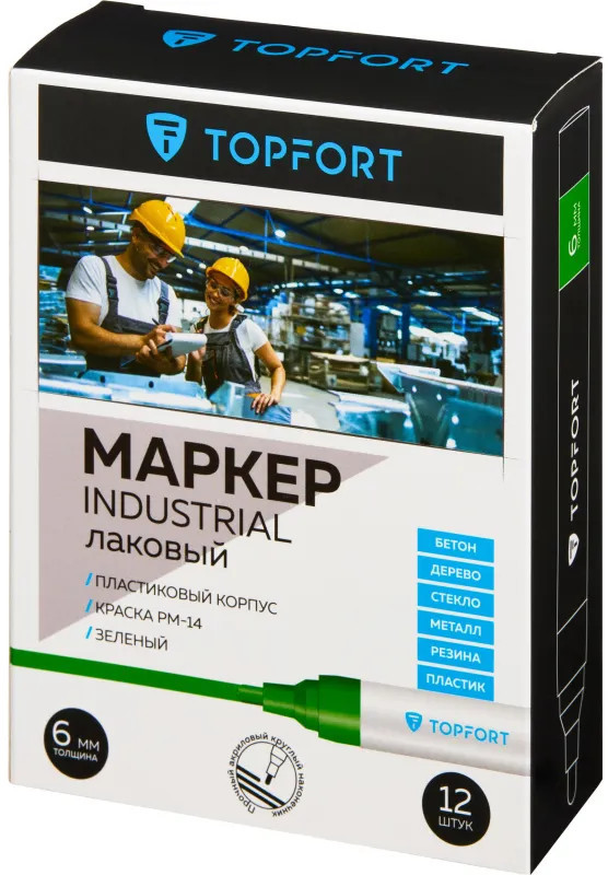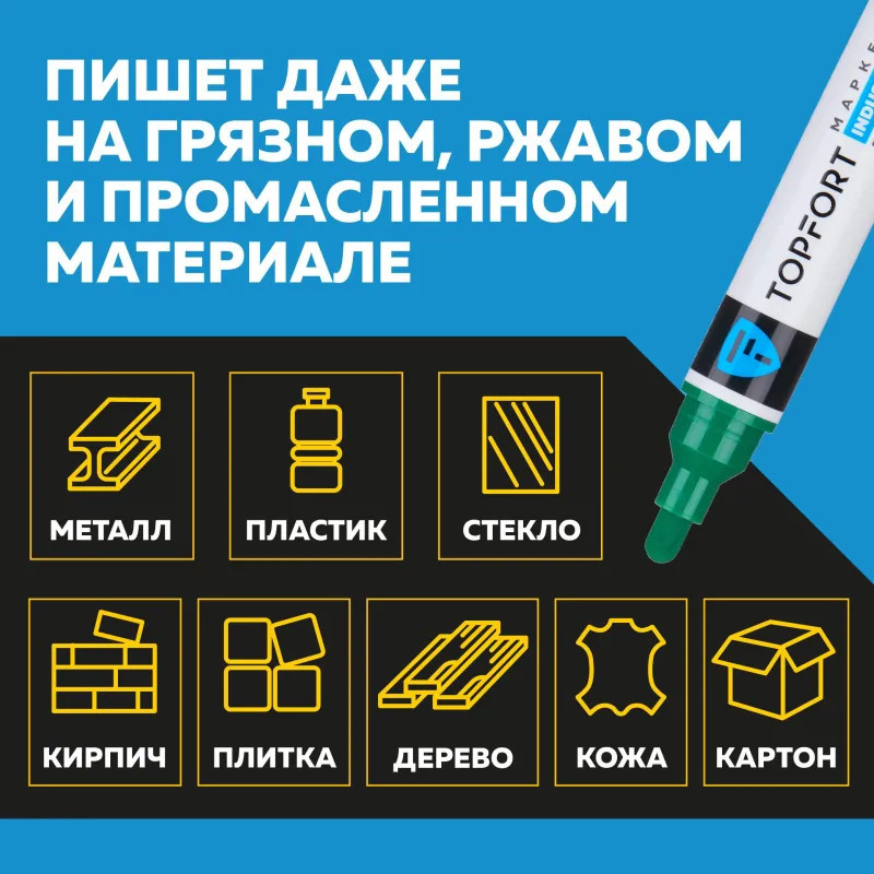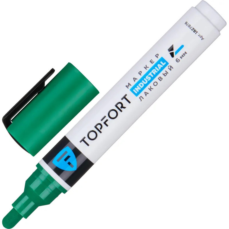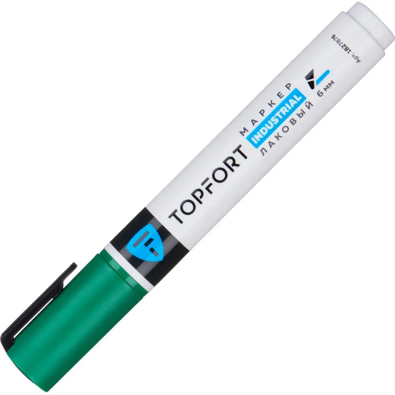 Маркер промышленный Topfort Industrial для универсальной маркировки зеленый (6 мм) предназначен для промышленной непрозрачной маркировки металла, стекла, пластика, дерева, резины, камня, картона, кирпича, текстиля, кожи (материал), бумаги, бетона. Краска содержит высококонцентрированный пигмент, хорошо ложится на гладкие и шероховатые поверхности. Может применяться для письма на жирных, пыльных, грязных поверхностях. После высыхания лаковые чернила устойчивы к воздействию света, атмосферных осадков, смазочных материалов, механическому истиранию. Создает стойкую линию толщиной 2 мм. Длина маркера — 130 мм. Цвет чернил: зеленый.
