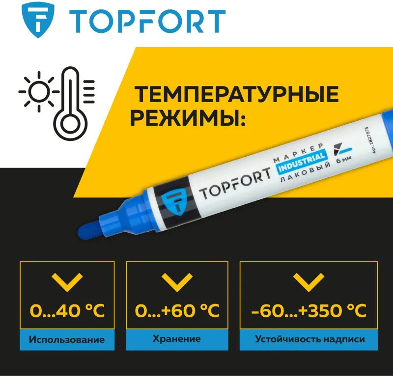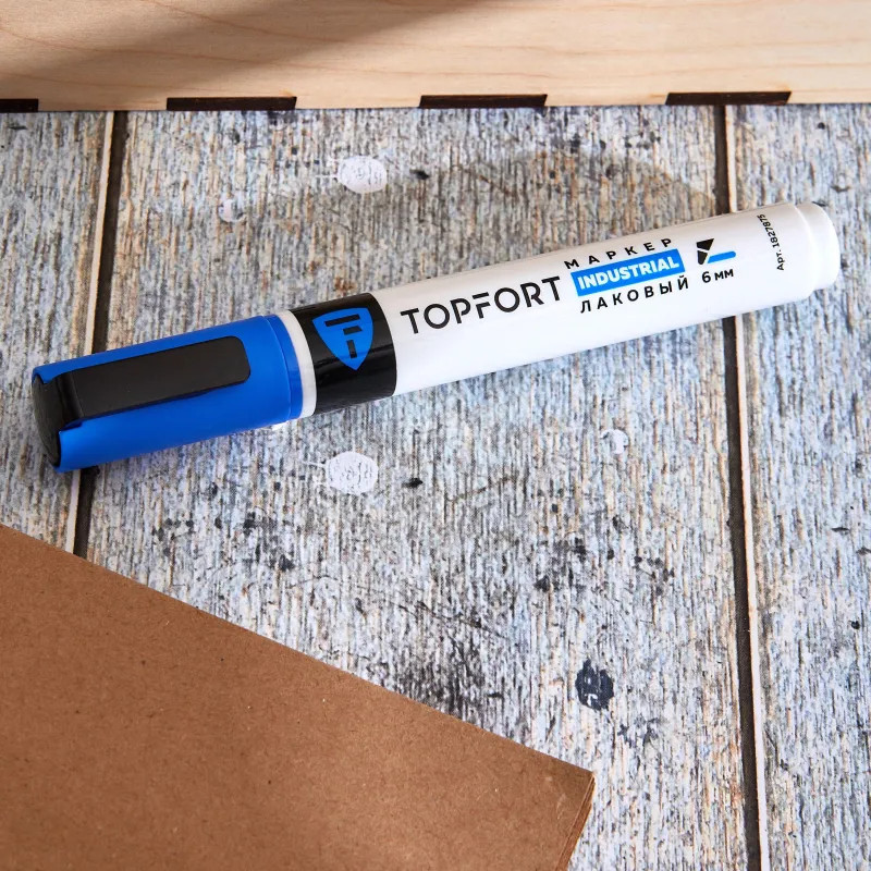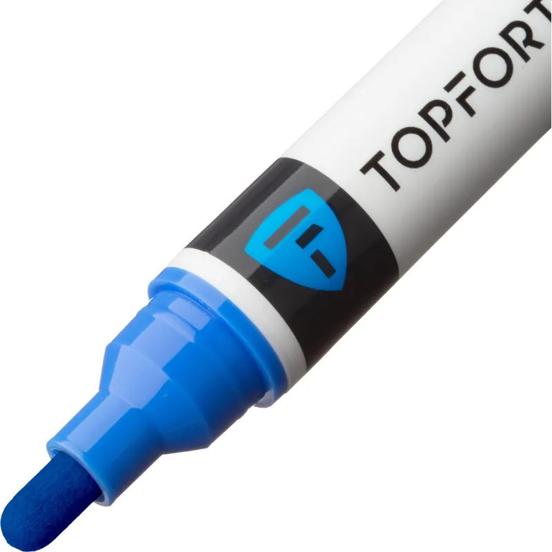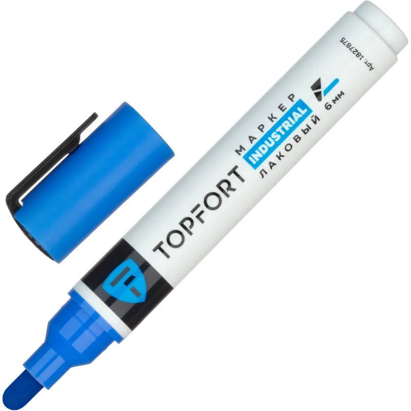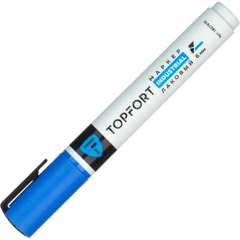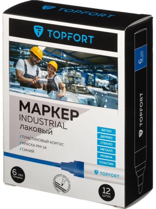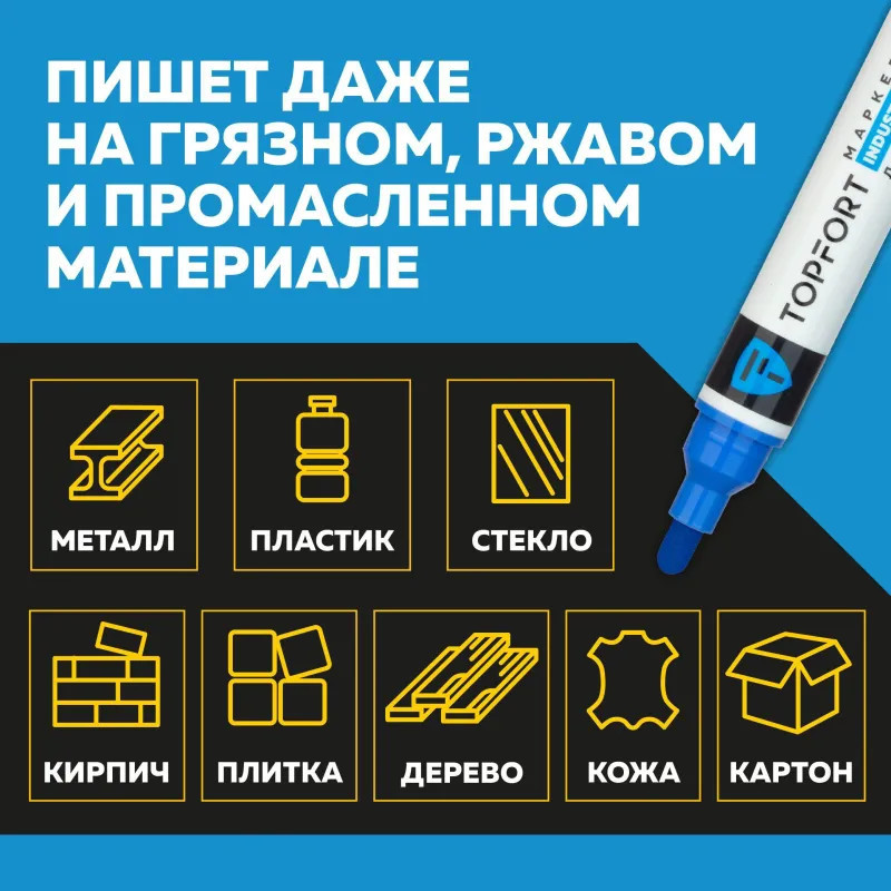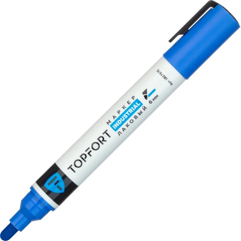 Маркер промышленный Topfort Industrial для универсальной маркировки синий (6 мм) предназначен для промышленной непрозрачной маркировки металла, стекла, пластика, дерева, резины, камня, картона, кирпича, текстиля, кожи (материал), бумаги, бетона. Краска содержит высококонцентрированный пигмент, хорошо ложится на гладкие и шероховатые поверхности. Может применяться для письма на жирных, пыльных, грязных поверхностях. После высыхания лаковые чернила устойчивы к воздействию света, атмосферных осадков, смазочных материалов, механическому истиранию. Создает стойкую линию толщиной 2 мм. Длина маркера — 130 мм. Цвет чернил: синий.