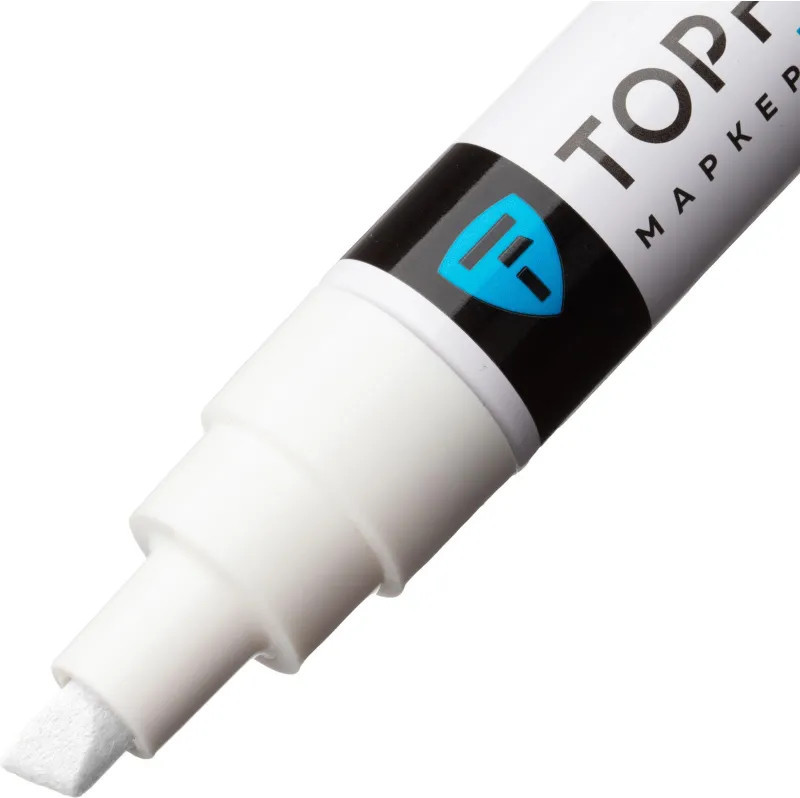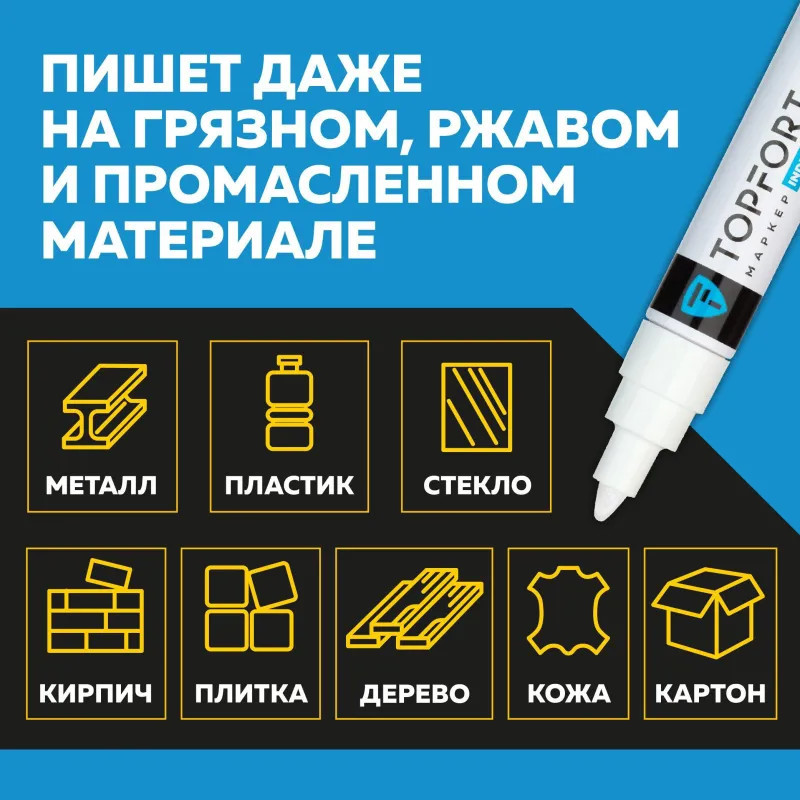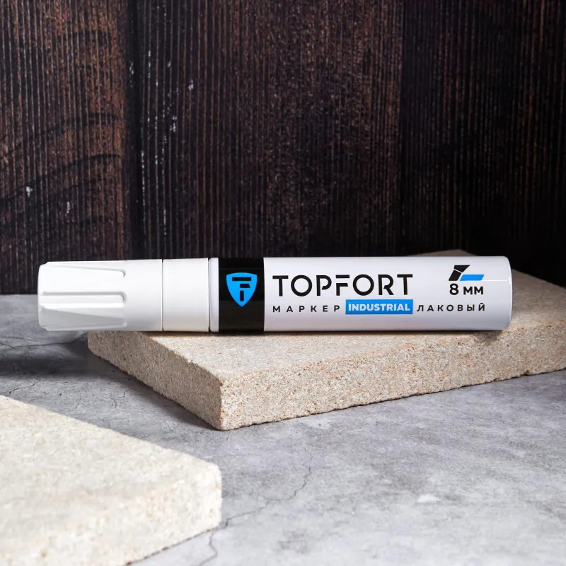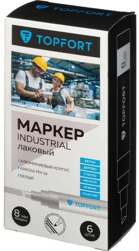 Маркер промышленный Topfort Industrial для универсальной маркировки белый (8 мм) предназначен для промышленной непрозрачной маркировки металла, стекла, пластика, дерева, резины, камня, картона, кирпича, текстиля, кожи (материал), бумаги, бетона. Краска содержит высококонцентрированный пигмент, хорошо ложится на гладкие и шероховатые поверхности. Может применяться для письма на жирных, пыльных, грязных поверхностях. После высыхания лаковые чернила устойчивы к воздействию света, атмосферных осадков, смазочных материалов, механическому истиранию. Создает стойкую линию толщиной 2 мм. Длина маркера — 130 мм. Цвет чернил: белый.