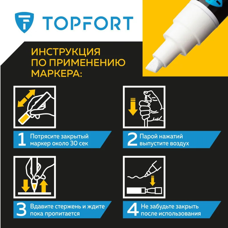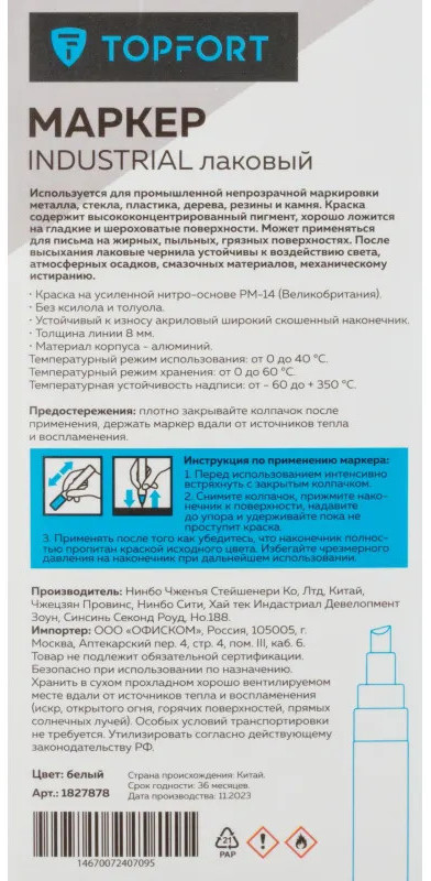 Предостережения: плотно закрывайте колпачок после применения, держать маркер вдали от источников тепла и воспламенения.
