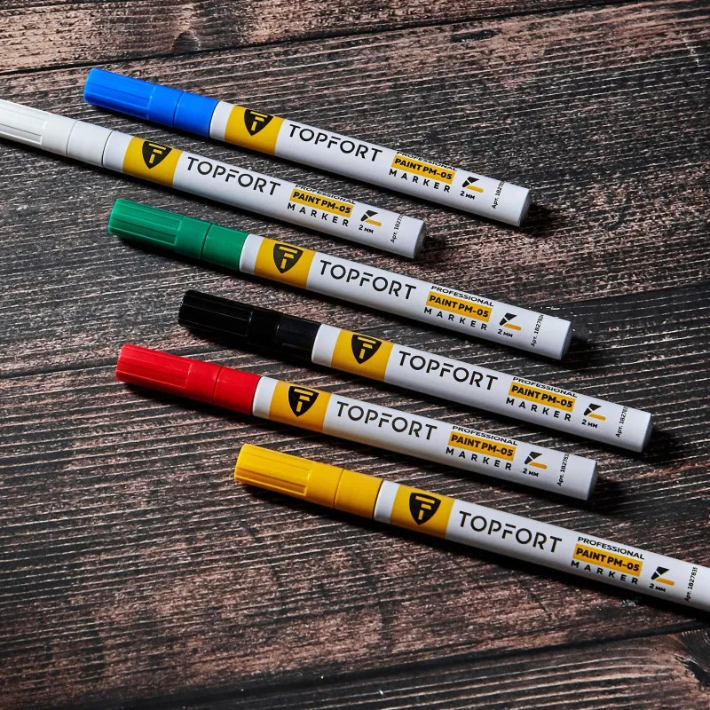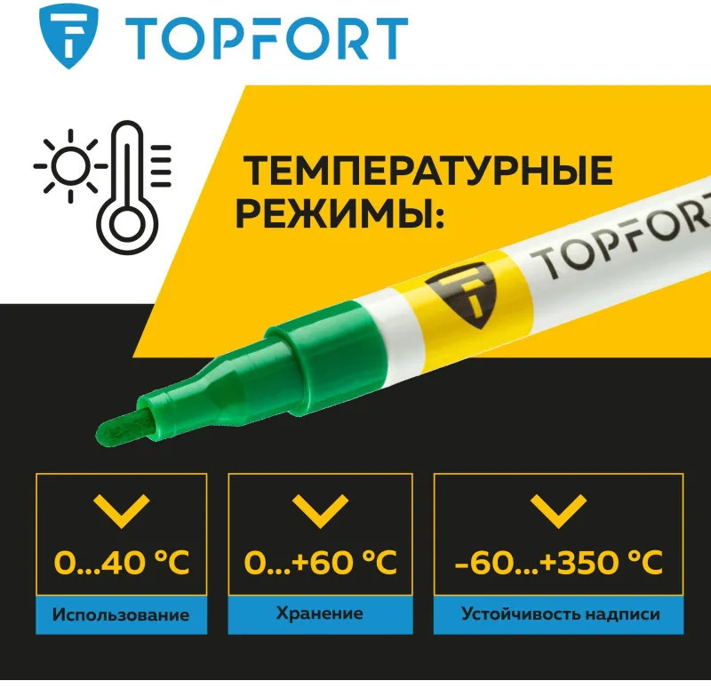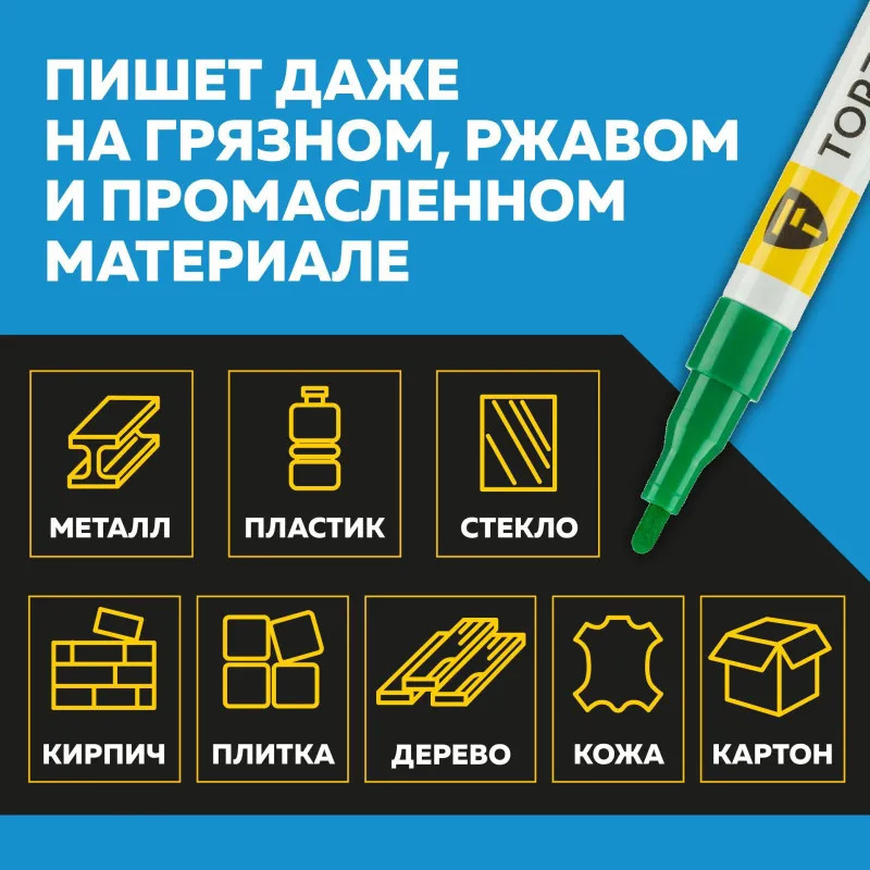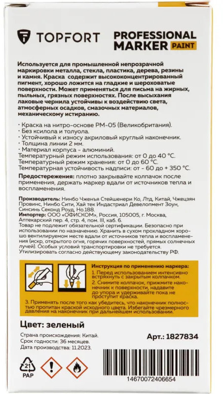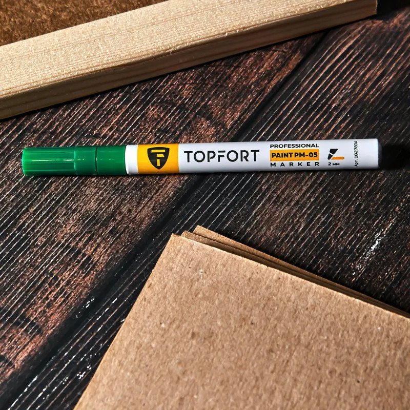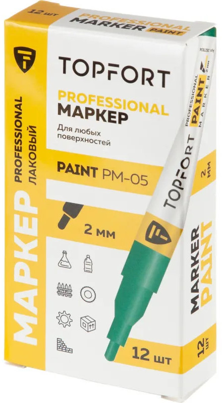 Маркер-краска Topfort Paint предназначен для промышленной непрозрачной маркировки металла, стекла, пластика, дерева, резины, камня, картона, кирпича, текстиля, кожи (материал), бумаги, бетона. Краска содержит высококонцентрированный пигмент, хорошо ложится на гладкие и шероховатые поверхности. Может применяться для письма на жирных, пыльных, грязных поверхностях. После высыхания лаковые чернила устойчивы к воздействию света, атмосферных осадков, смазочных материалов, механическому истиранию. Цвет чернил — зеленый, диаметр пишущего узла — 2 мм. Размеры маркера: диаметр 11 мм, длина 130 мм.