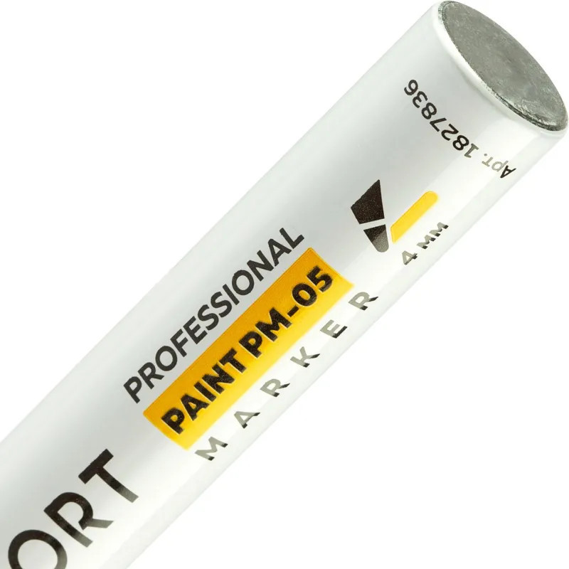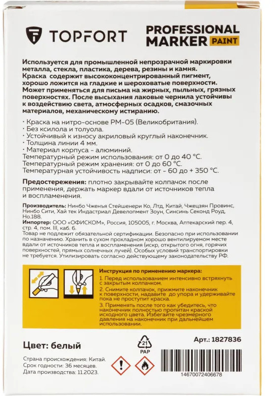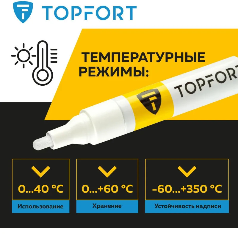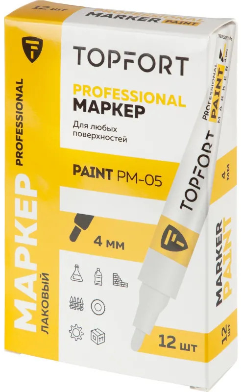 Маркер-краска Topfort Paint предназначен для промышленной непрозрачной маркировки металла, стекла, пластика, дерева, резины, камня, картона, кирпича, текстиля, кожи (материал), бумаги, бетона. Краска содержит высококонцентрированный пигмент, хорошо ложится на гладкие и шероховатые поверхности. Может применяться для письма на жирных, пыльных, грязных поверхностях. После высыхания лаковые чернила устойчивы к воздействию света, атмосферных осадков, смазочных материалов, механическому истиранию. Цвет чернил — белый, диаметр пишущего узла — 4 мм. Размеры маркера: диаметр 15 мм, длина 143 мм.