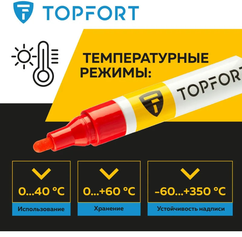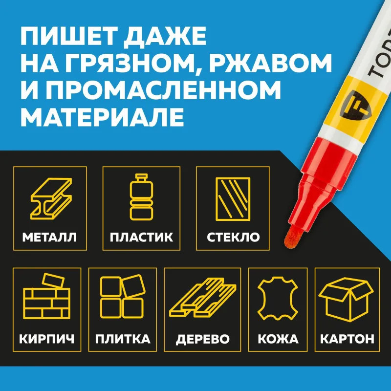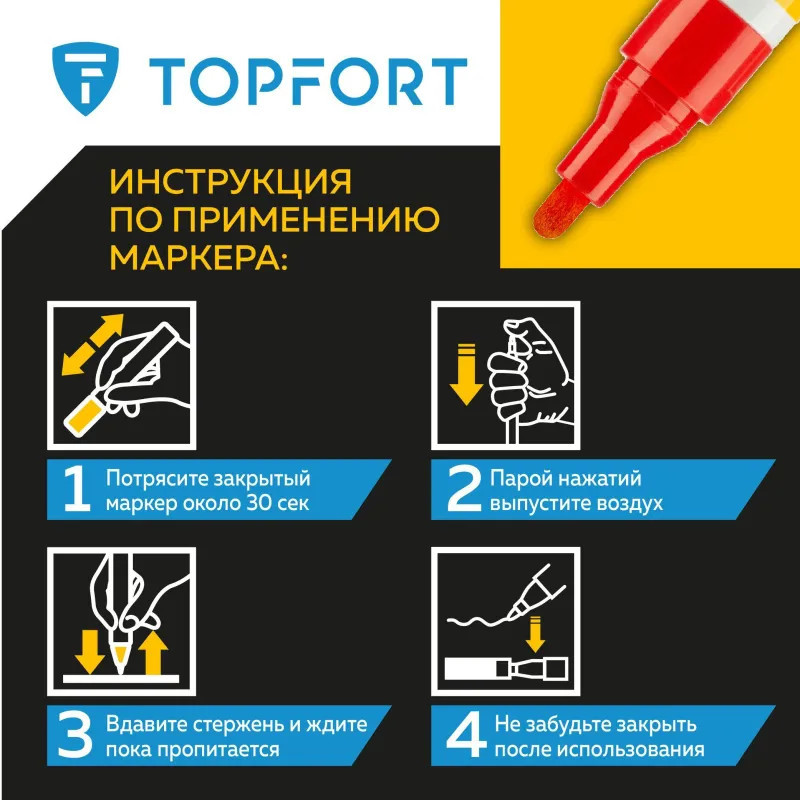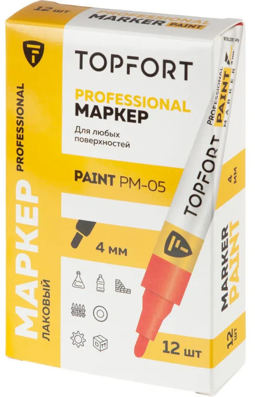 Маркер-краска Topfort Paint предназначен для промышленной непрозрачной маркировки металла, стекла, пластика, дерева, резины, камня, картона, кирпича, текстиля, кожи (материал), бумаги, бетона. Краска содержит высококонцентрированный пигмент, хорошо ложится на гладкие и шероховатые поверхности. Может применяться для письма на жирных, пыльных, грязных поверхностях. После высыхания лаковые чернила устойчивы к воздействию света, атмосферных осадков, смазочных материалов, механическому истиранию. Цвет чернил — красный, диаметр пишущего узла — 4 мм. Размеры маркера: диаметр 15 мм, длина 143 мм.