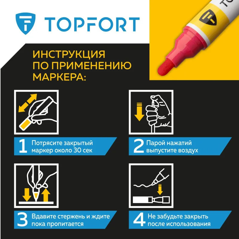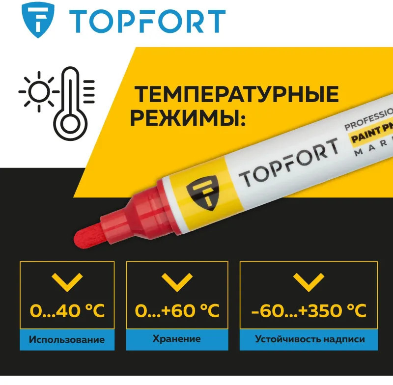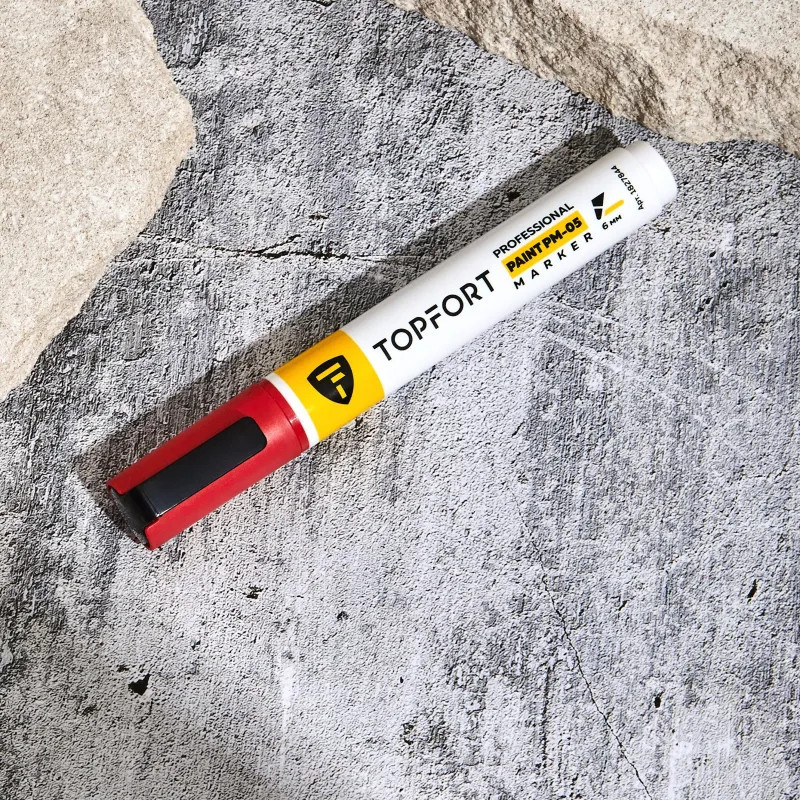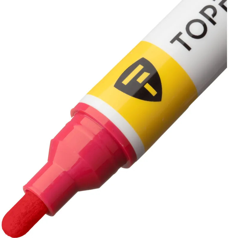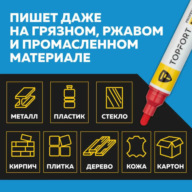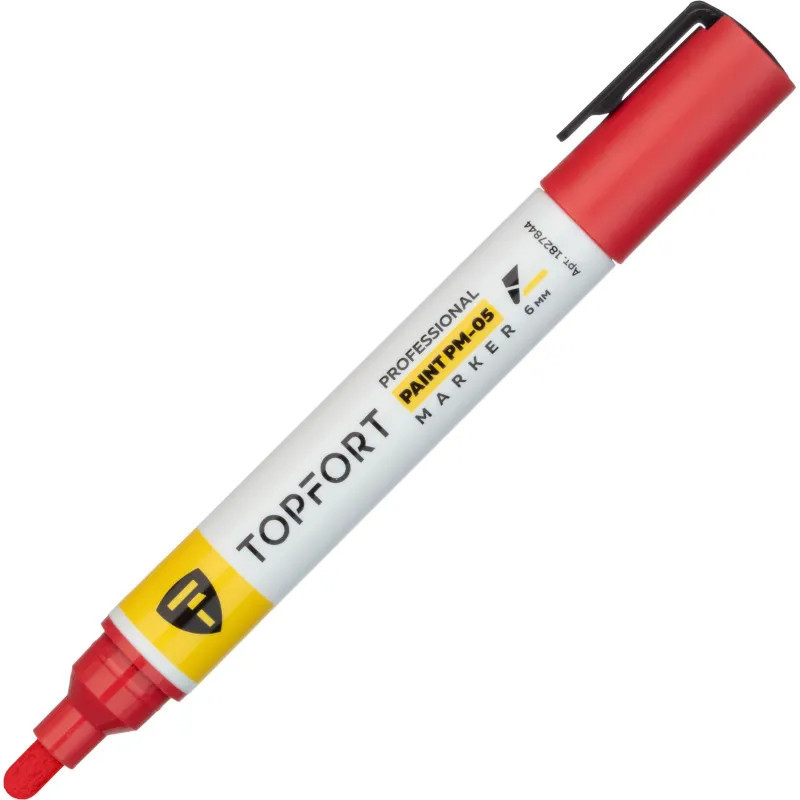 Маркер-краска Topfort Paint предназначен для промышленной непрозрачной маркировки металла, стекла, пластика, дерева, резины, камня, картона, кирпича, текстиля, кожи (материал), бумаги, бетона. Краска содержит высококонцентрированный пигмент, хорошо ложится на гладкие и шероховатые поверхности. Может применяться для письма на жирных, пыльных, грязных поверхностях. После высыхания лаковые чернила устойчивы к воздействию света, атмосферных осадков, смазочных материалов, механическому истиранию. Цвет чернил — красный, диаметр пишущего узла — 6 мм. Размеры маркера: диаметр 18 мм, длина 142 мм.