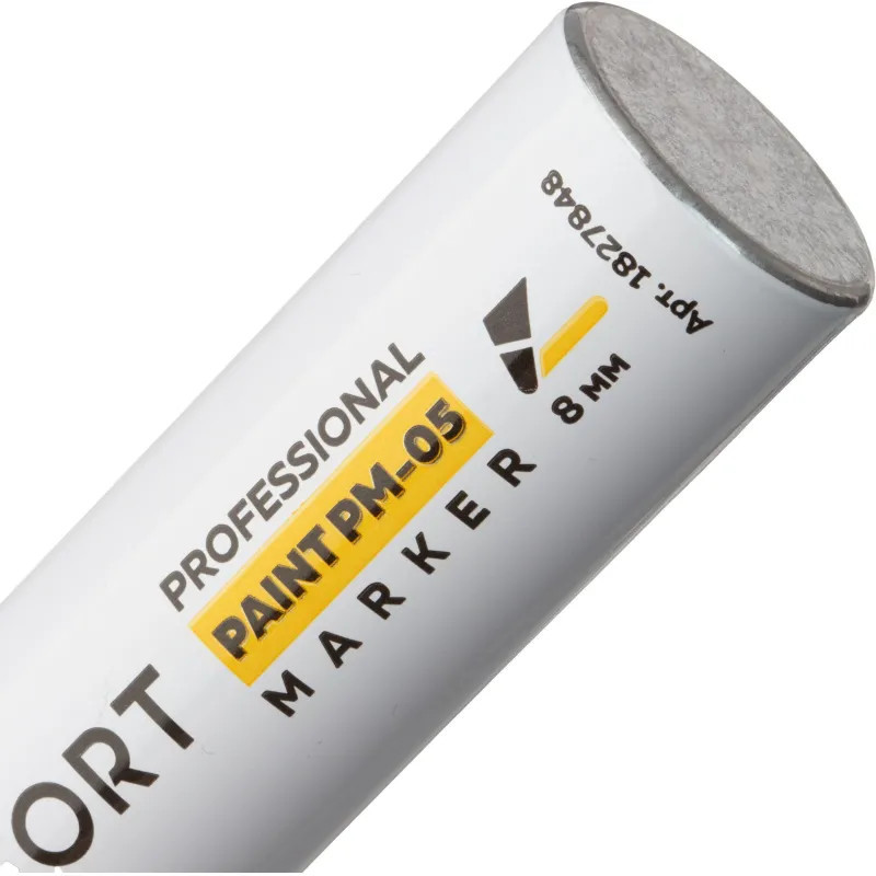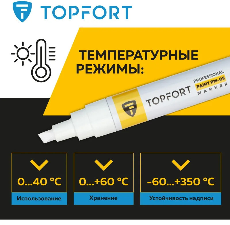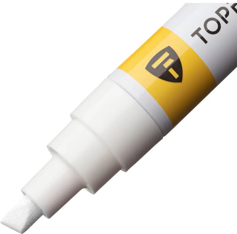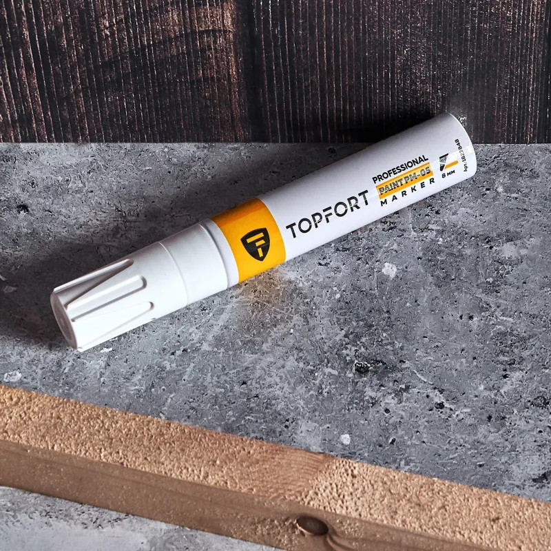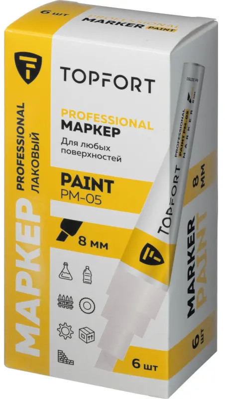 Маркер-краска Topfort Paint предназначен для промышленной непрозрачной маркировки металла, стекла, пластика, дерева, резины, камня, картона, кирпича, текстиля, кожи (материал), бумаги, бетона. Краска содержит высококонцентрированный пигмент, хорошо ложится на гладкие и шероховатые поверхности. Может применяться для письма на жирных, пыльных, грязных поверхностях. После высыхания лаковые чернила устойчивы к воздействию света, атмосферных осадков, смазочных материалов, механическому истиранию. Цвет чернил — белый, диаметр пишущего узла — 8 мм. Размеры маркера: диаметр 25 мм, длина 157 мм.