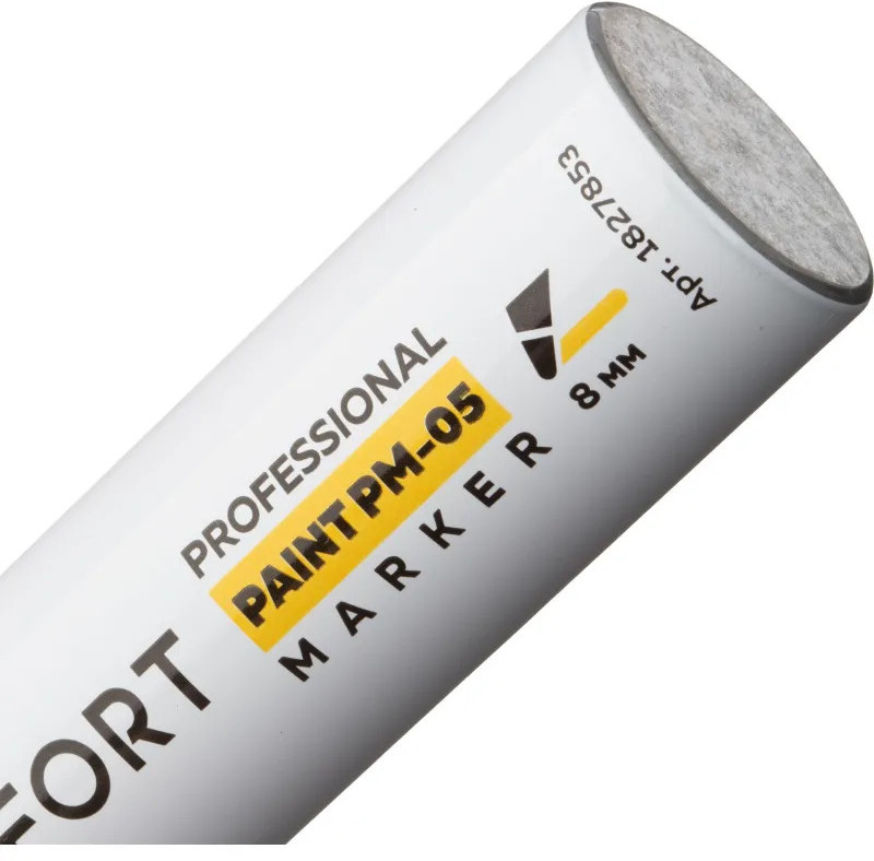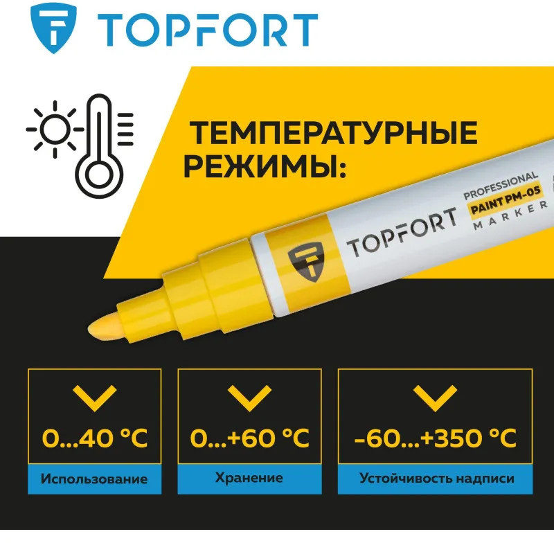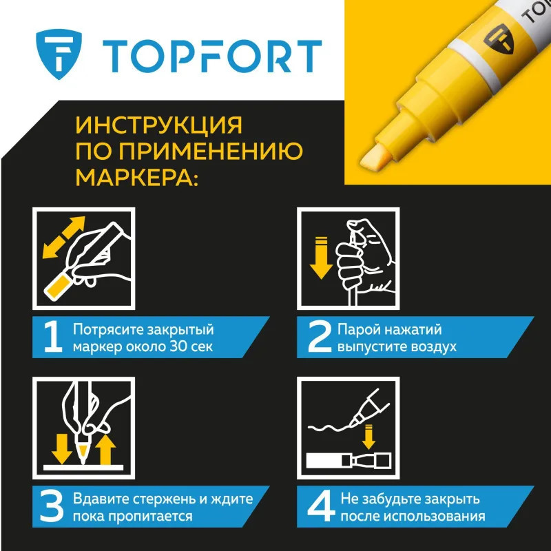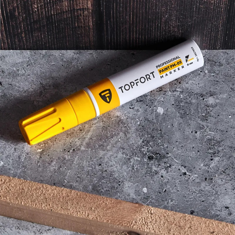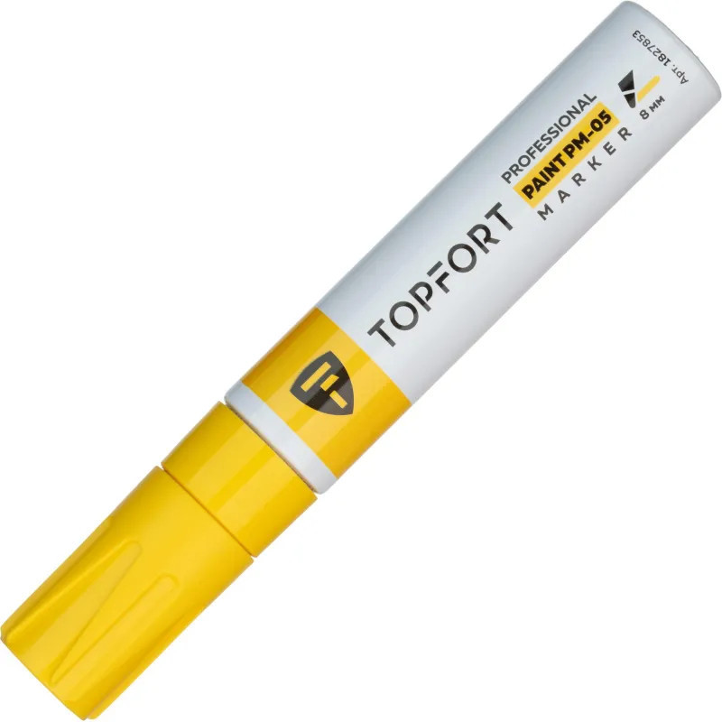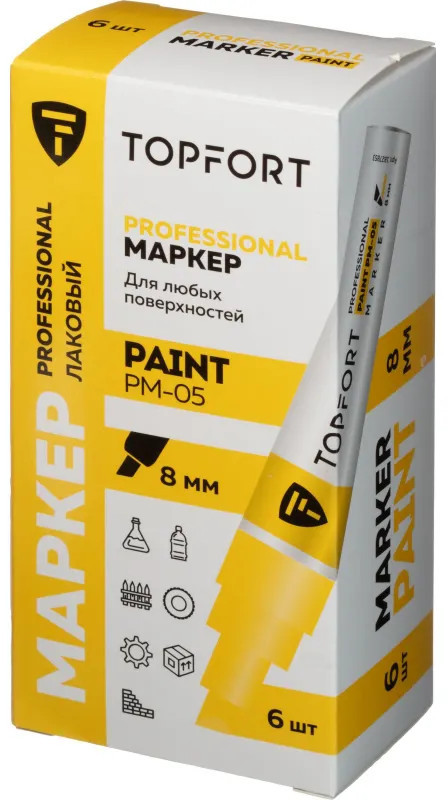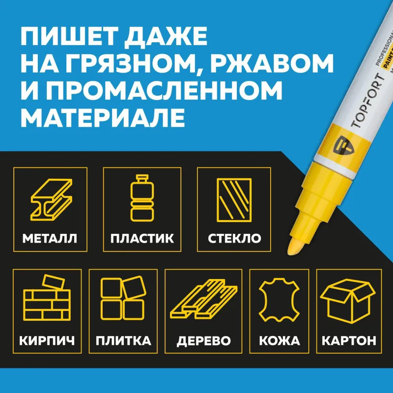 Маркер-краска Topfort Paint предназначен для промышленной непрозрачной маркировки металла, стекла, пластика, дерева, резины, камня, картона, кирпича, текстиля, кожи (материал), бумаги, бетона. Краска содержит высококонцентрированный пигмент, хорошо ложится на гладкие и шероховатые поверхности. Может применяться для письма на жирных, пыльных, грязных поверхностях. После высыхания лаковые чернила устойчивы к воздействию света, атмосферных осадков, смазочных материалов, механическому истиранию. Цвет чернил — желтый, диаметр пишущего узла — 8 мм. Размеры маркера: диаметр 25 мм, длина 157 мм.