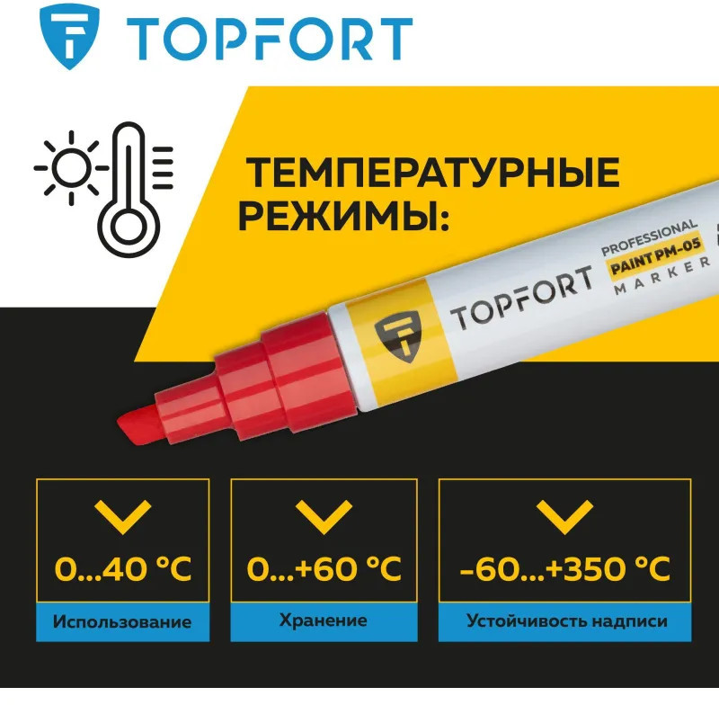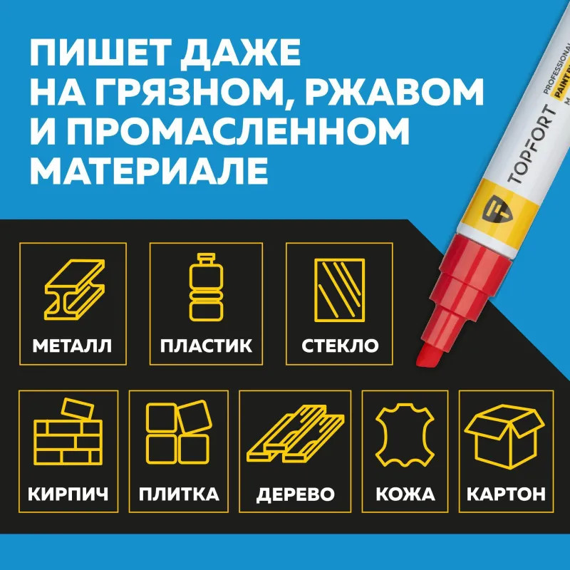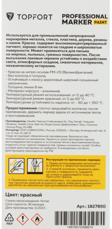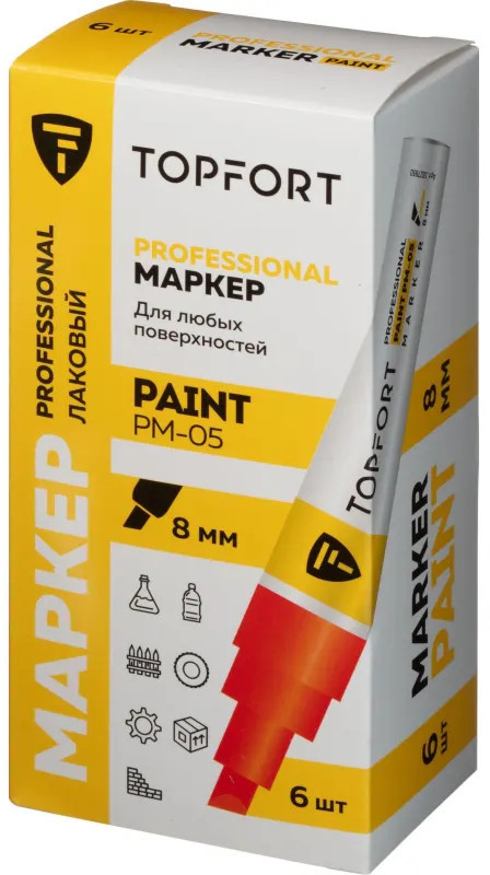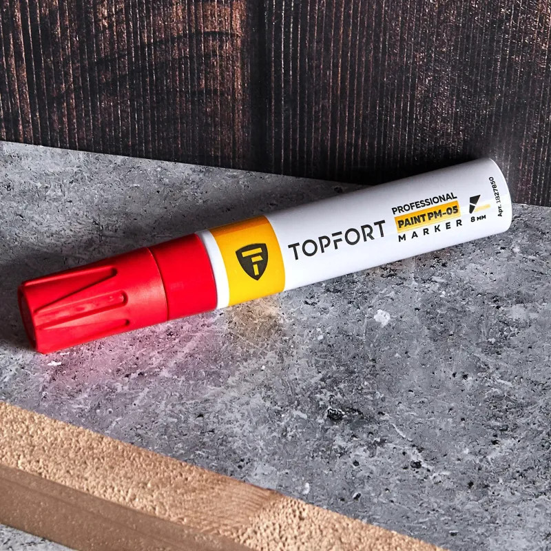 Маркер-краска Topfort Paint предназначен для промышленной непрозрачной маркировки металла, стекла, пластика, дерева, резины, камня, картона, кирпича, текстиля, кожи (материал), бумаги, бетона. Краска содержит высококонцентрированный пигмент, хорошо ложится на гладкие и шероховатые поверхности. Может применяться для письма на жирных, пыльных, грязных поверхностях. После высыхания лаковые чернила устойчивы к воздействию света, атмосферных осадков, смазочных материалов, механическому истиранию. Цвет чернил — красный, диаметр пишущего узла — 8 мм. Размеры маркера: диаметр 25 мм, длина 157 мм.