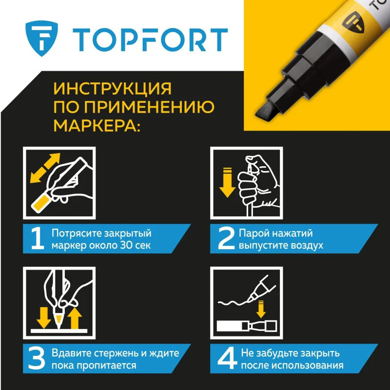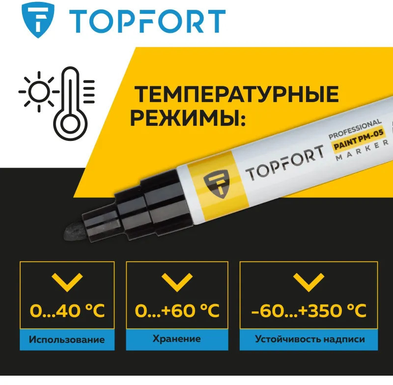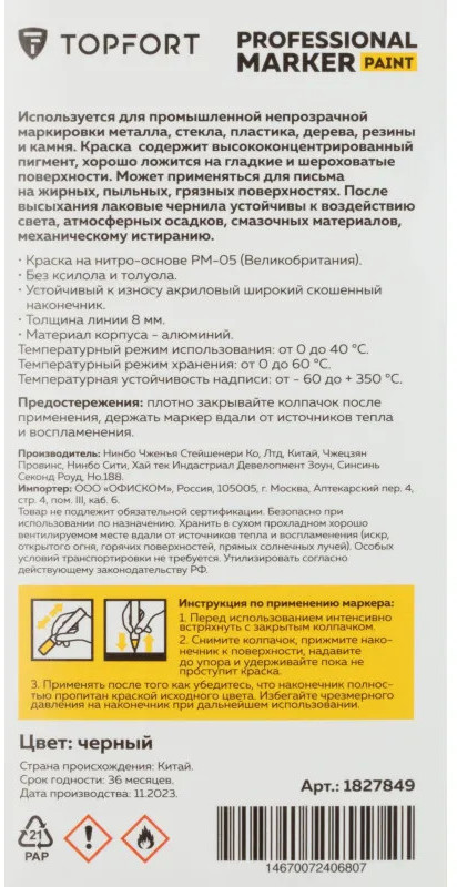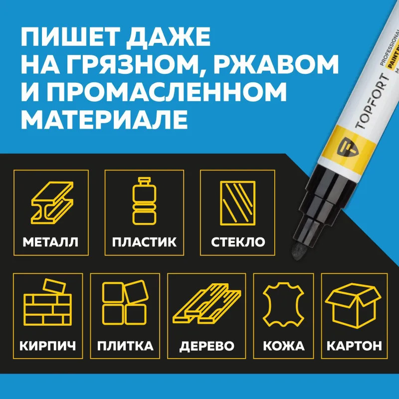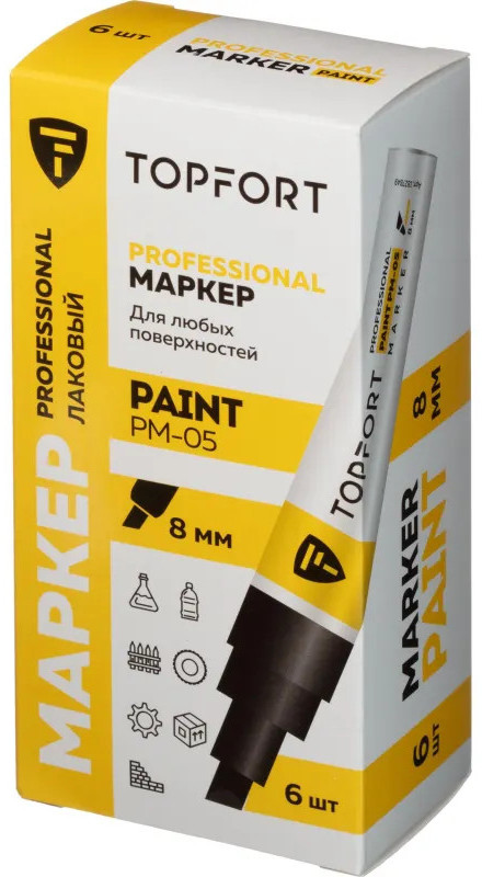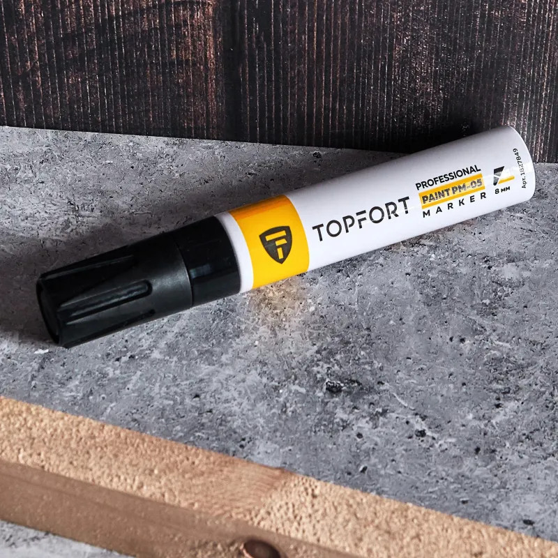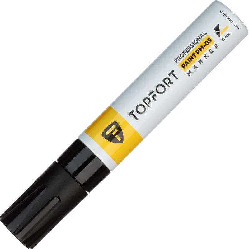Маркер-краска Topfort Paint предназначен для промышленной непрозрачной маркировки металла, стекла, пластика, дерева, резины, камня, картона, кирпича, текстиля, кожи (материал), бумаги, бетона. Краска содержит высококонцентрированный пигмент, хорошо ложится на гладкие и шероховатые поверхности. Может применяться для письма на жирных, пыльных, грязных поверхностях. После высыхания лаковые чернила устойчивы к воздействию света, атмосферных осадков, смазочных материалов, механическому истиранию. Цвет чернил — черный, диаметр пишущего узла — 8 мм. Размеры маркера: диаметр 25 мм, длина 157 мм.