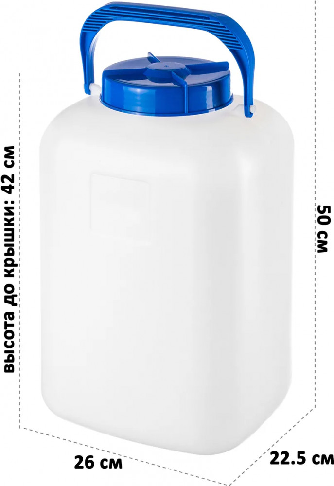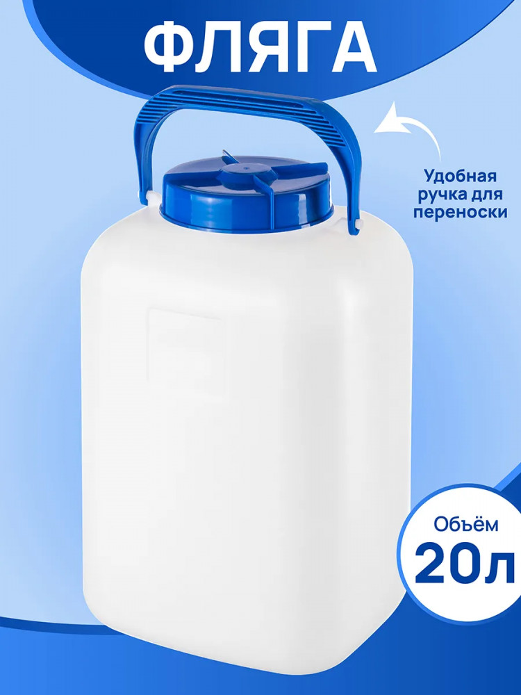 Фляга-бидон предназначена для безопасного хранения и транспортировки жидкостей и пищевых продуктов. Размер изделия — 26×22,5×42 см, объём — 20 литров. Высота с ручкой — 50 см. Выполнена из полиэтилена высокой плотности — прочного и лёгкого пластика, не содержащего бисфенол А и другие вредные вещества. Он не впитывает посторонние ароматы и устойчив к влаге, что позволит длительное время хранить большие запасы продуктов. Белая пластиковая фляга герметично закрывается крышкой, обеспечивающей надёжную защиту содержимого. Канистра оснащена прочной ручкой, благодаря которой даже полную тару будет удобно переносить. Храните и перевозите в ней большие объёмы питьевой воды или используйте в качестве молочной тары на кухне. Ёмкость также подходит для хранения сахара, муки, круп и других сыпучих продуктов. На даче пластиковая бочка поможет с хранением садовой воды для полива. Пищевая тара станет надёжным и удобным помощником в хозяйстве дома и на даче.