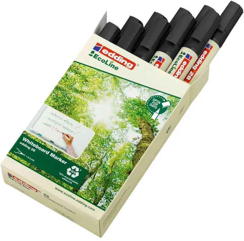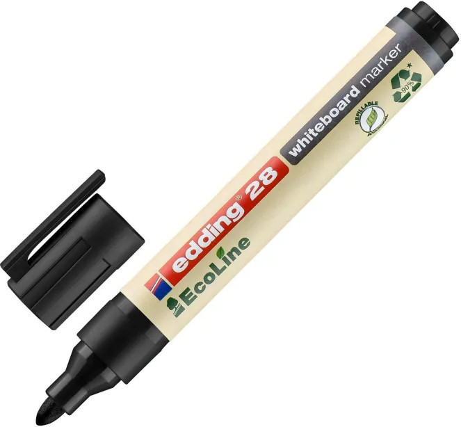 Маркер для досок Edding 28 на 90% произведен из вторичного переработанного пластика. Если после насыщенной презентации или лекции вы забудете закрыть маркер колпачком, не стоит беспокоиться: чернила не высохнут даже спустя несколько дней. Маркер можно повторно заправлять и использовать много раз, и это делает его не только экологичным, но и экономически эффективным, что особенно актуально для офисов или образовательных учреждений. Чернила на спиртовой основе.