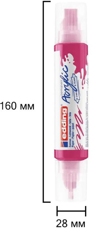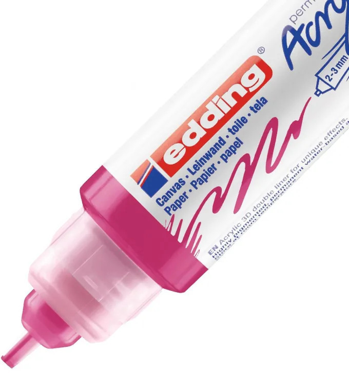 Маркер акриловый Edding 3D 5400/909 двухсторонний розовый (толщина линии 2-10 мм). Двусторонний 3D-маркер позволяет создавать настоящие объёмные рисунки. Слегка надавите на корпус — и волшебство начинается! Сильнее нажим — объёмнее линия. Двусторонняя трубка имеет два сопла с шириной хода 2-3 мм и 5-10 мм. 3D-маркер Edding 5400 — яркий представитель акриловой линейки Edding. Акриловые маркеры Edding — целый набор инструментов для живописи. Чернила содержат высокопигментированную светостойкую и перманентную акриловую краску на водной основе. Созданы для рисования как на бумаге или картоне, так и на холсте. Вы получите эффект настоящих красок, но в более удобной форме маркера.