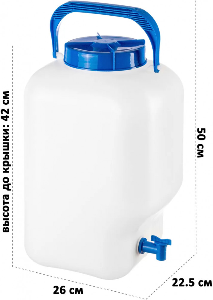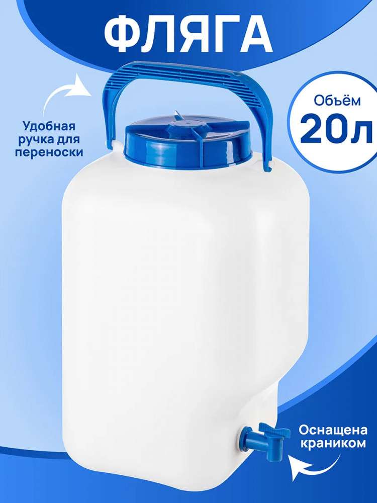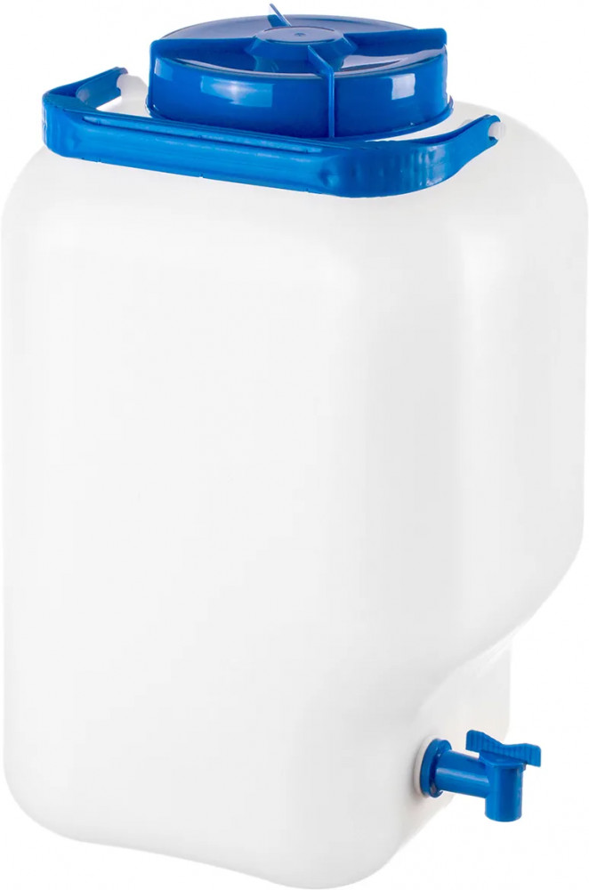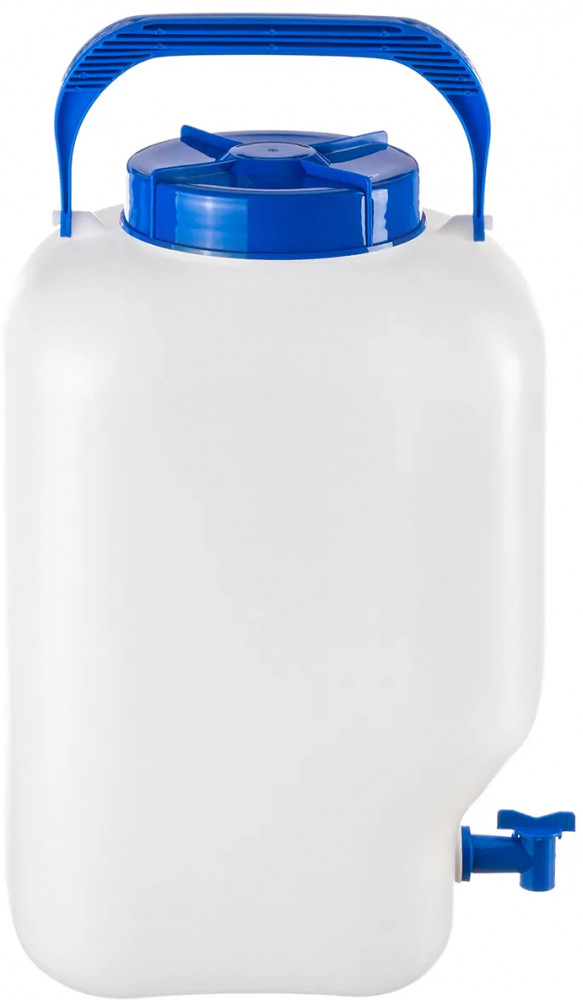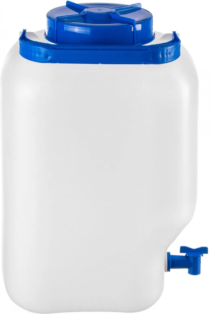 Фляга-бидон предназначена для безопасного хранения и транспортировки жидкостей и пищевых продуктов. Размер изделия — 26×22,5×42 см, объём — 20 литров. Высота с ручкой — 50 см. Выполнена из полиэтилена высокой плотности — прочного и лёгкого пластика, не содержащего бисфенол А и другие вредные вещества. Он не впитывает посторонние ароматы и устойчив к влаге, что позволит длительное время хранить большие запасы продуктов. Белая пластиковая фляга герметично закрывается крышкой, обеспечивающей надёжную защиту содержимого. Канистра оснащена прочной ручкой, благодаря которой даже полную тару будет удобно переносить. Расположенный внизу бочки кран поможет с лёгкостью набрать необходимое количество воды, не открывая сам сосуд. Храните и перевозите в ней большие объёмы питьевой воды или используйте в качестве молочной тары на кухне. Ёмкость также подходит для хранения сахара, муки, круп и других сыпучих продуктов. На даче пластиковая бочка поможет с хранением садовой воды для полива. Пищевая тара станет надёжным и удобным помощником в хозяйстве дома и на даче.