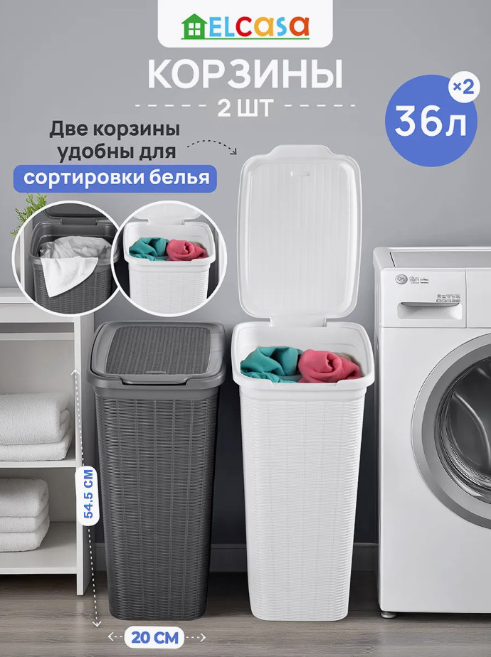 Набор 2 бельевых корзин с крышкой от El Casa предназначен для организации хранения в вашем доме. Размер каждого изделия — 39×28,5×54,5 см, объём — 36 литров. Размер дна — 29×20 см. Выполнены из полипропилена — прочного пластика, который не содержит бисфенол А и другие вредные вещества. Благодаря своему лаконичному, но изысканному внешнему виду изделия впишутся в любой интерьер и найдут место в любой части вашего дома. Оснащены удобными крышками, надёжно закрывающими содержимое.