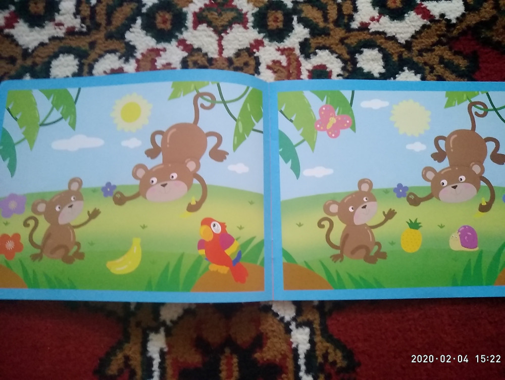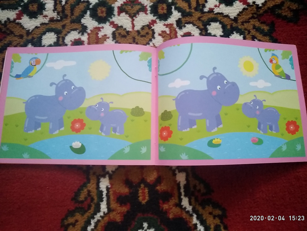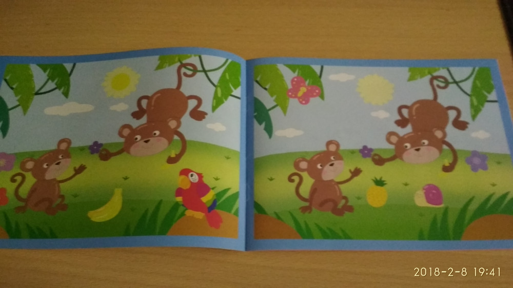 Замечательная книжка для развития внимания и наблюдательности. В книге 7 картинок для сравнения. Странички глянцевые, так что наклейки можно будет отклеить, если наклеили неправильно. Формат книги А5, очень удобно сравнивать 2 картинки. Заказала всю серию.