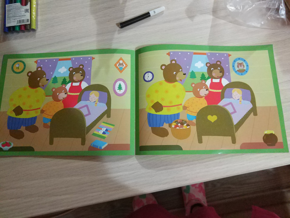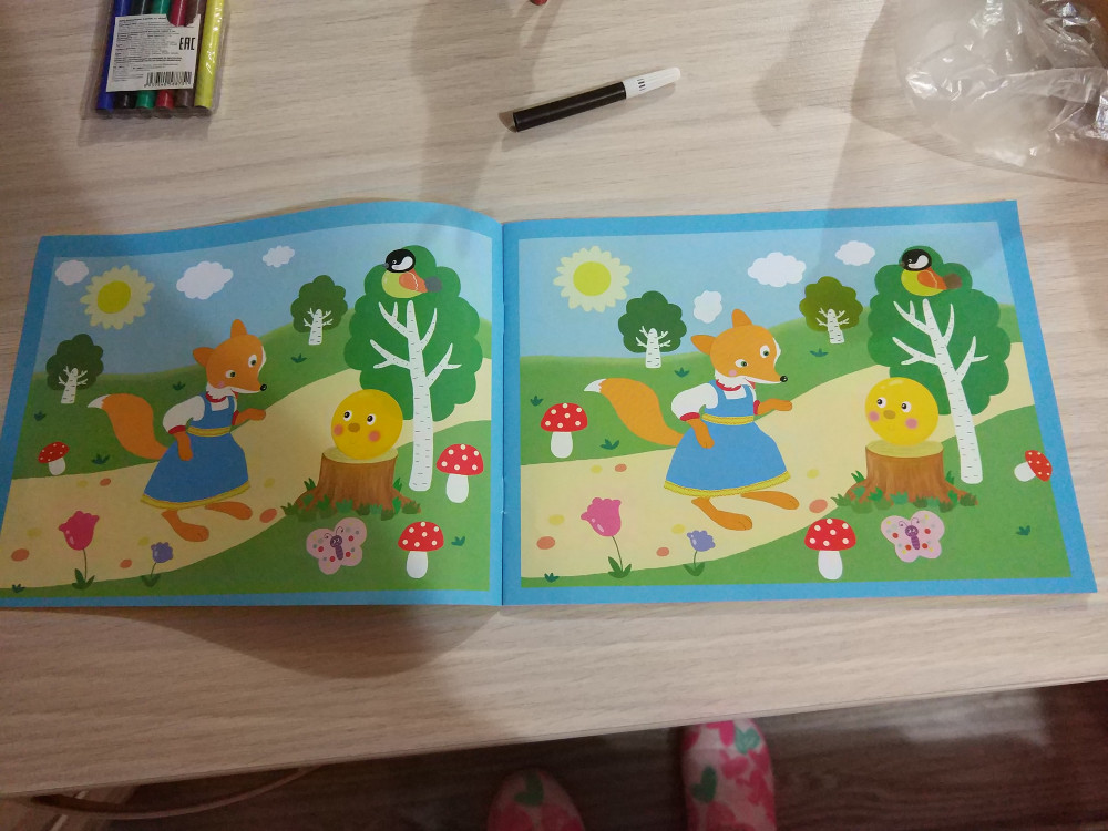 Замечательная книжка для развития внимания и наблюдательности. В книге 7 картинок для сравнения (сказки узнаваемы даже для малышей). Странички глянцевые, так что наклейки можно будет отклеить, если наклеили неправильно. Формат книги А5, очень удобно сравнивать 2 картинки. Брала книгу на пробу, теперь буду заказывать все остальные из этой серии.