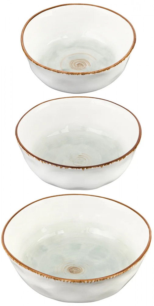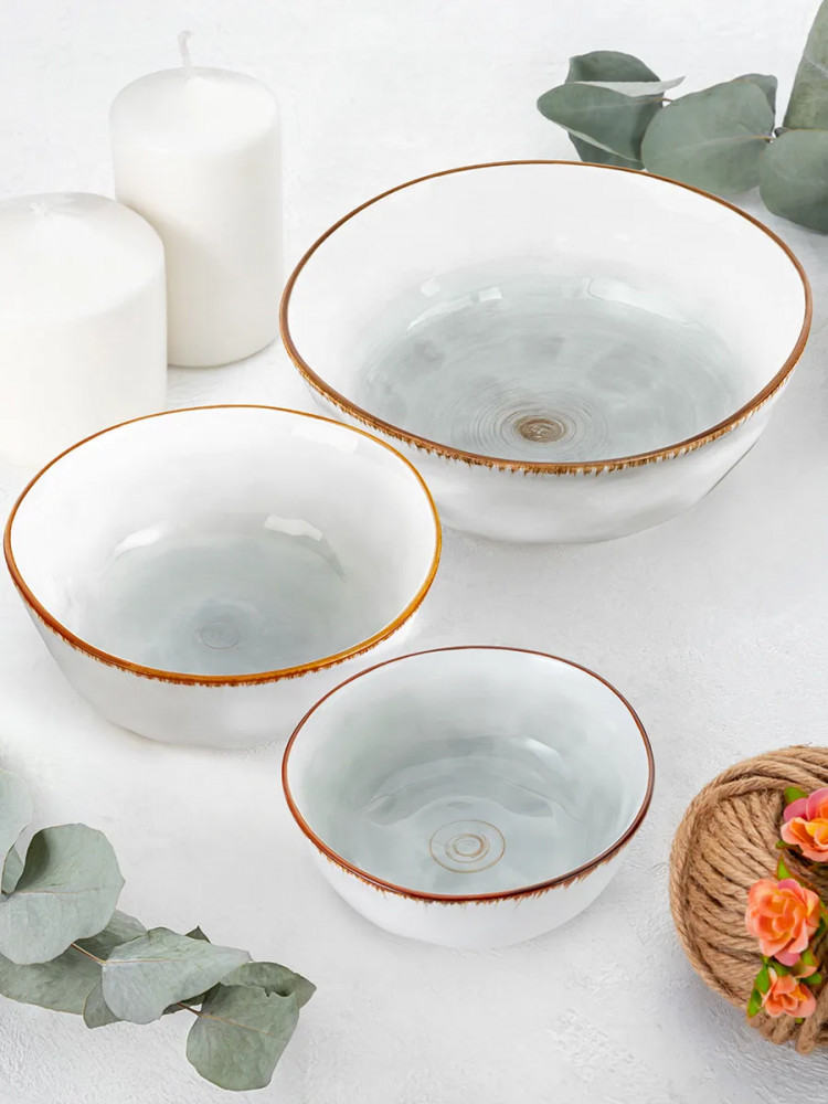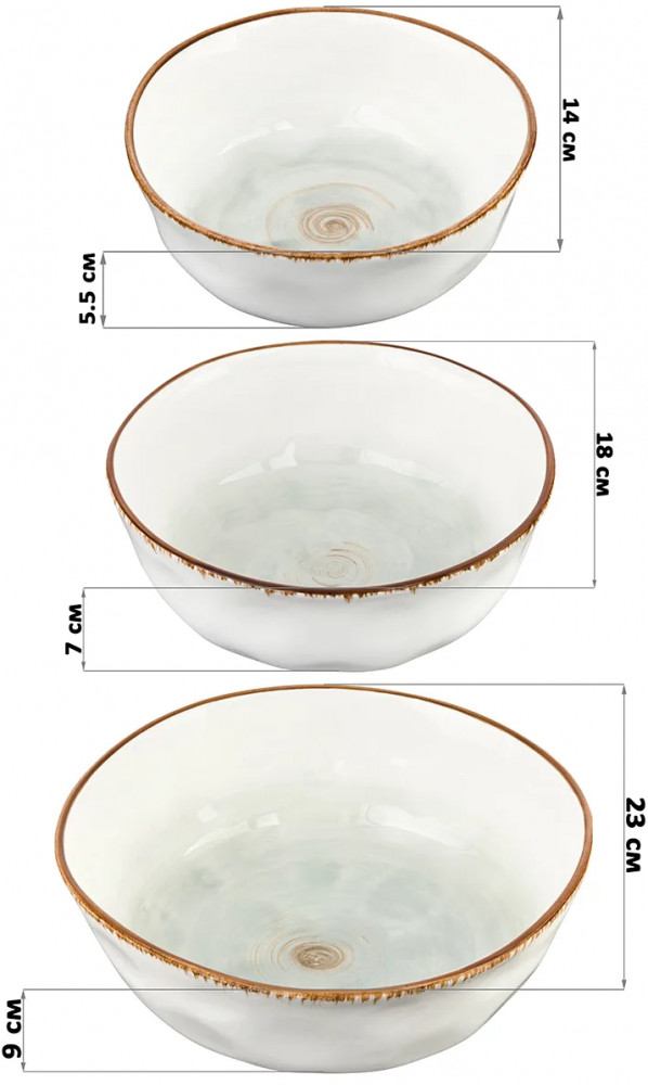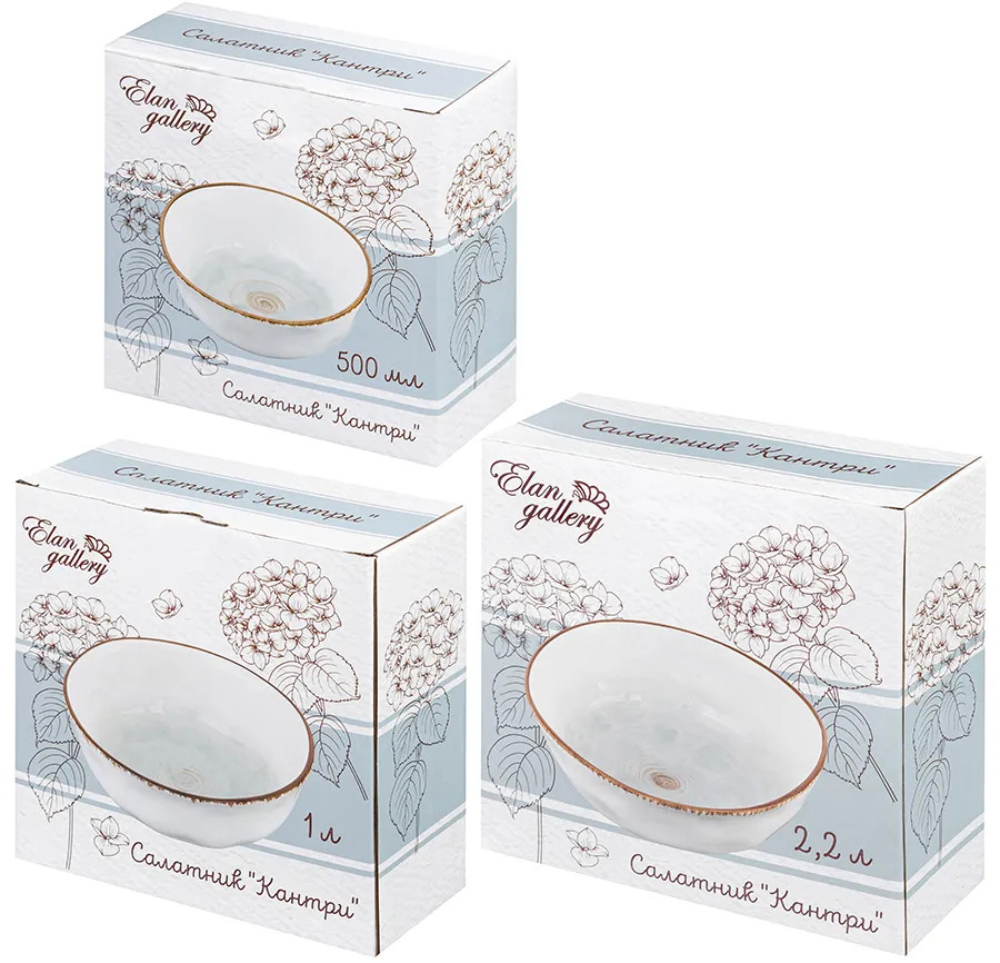 Набор состоит из 3 салатников-суповых тарелок Elan Gallery серии «Кантри» объемом 500 мл, 1 л, 2,2 л. Каждый салатник имеет удобный размер и большой объем, что позволяет вместить достаточное количество пищи. Набор глубоких салатников подойдет для красивой сервировки стола и станет эстетичным дополнением сервиза. Сервировочные салатники могут быть использованы для подачи различных блюд, включая первое, салаты, супы, бульоны, каши, закуски, сладкое, десерты, овощи, сухофрукты. Салатник можно использовать как пиалу для варенья. Столовые супницы — салатницы для горячего выполнены из высококачественного белого фарфора, обладают интересной необычной геометрией и насыщенным декоративным оттенком.