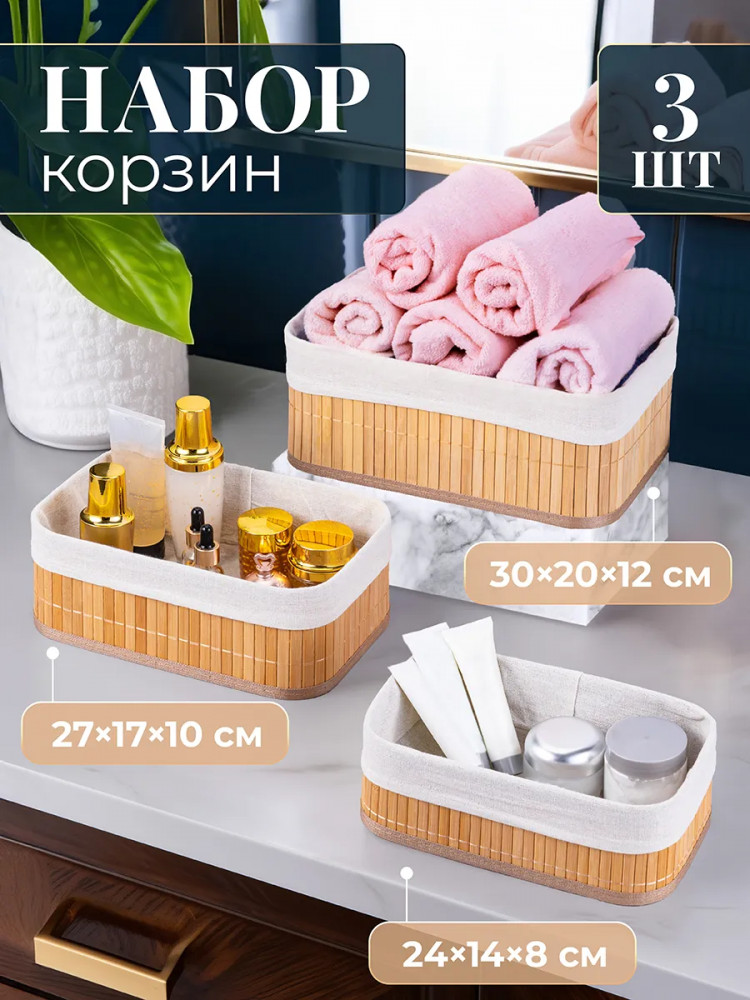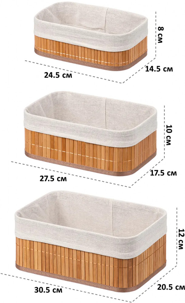 Выполнены из бамбука и МДФ, оснащены мягкой обивкой из поликоттона. Это практичный и прочный материал, обладающий приятной на ощупь структурой и устойчивостью к износу. Он не подвержен накоплению пыли и легко очищается, благодаря чему изделие идеально подходит для внутренней отделки органайзеров. Красивый и лаконичный дизайн, сочетающий текстуру белого дерева и серую ткань, позволит органайзерам найти место в любой части вашей квартиры. В прихожей они помогут хранить шарфы, перчатки и шапки. В спальне компактно сложите в них тапочки, наволочки или уходовую косметику — кремы и масла. Расположите их в детской комнате под игрушки и книжки, на кухне — под кухонные полотенца или баночки со специями и приправами. Настольные органайзеры можно приспособить под художественные принадлежности и приборы для рукоделия: альбомы, кисточки, нитки или пряжу. Послужат в качестве офисных, позволяя держать под рукой папки и документы. Корзиночки создадут уют в любом помещении.