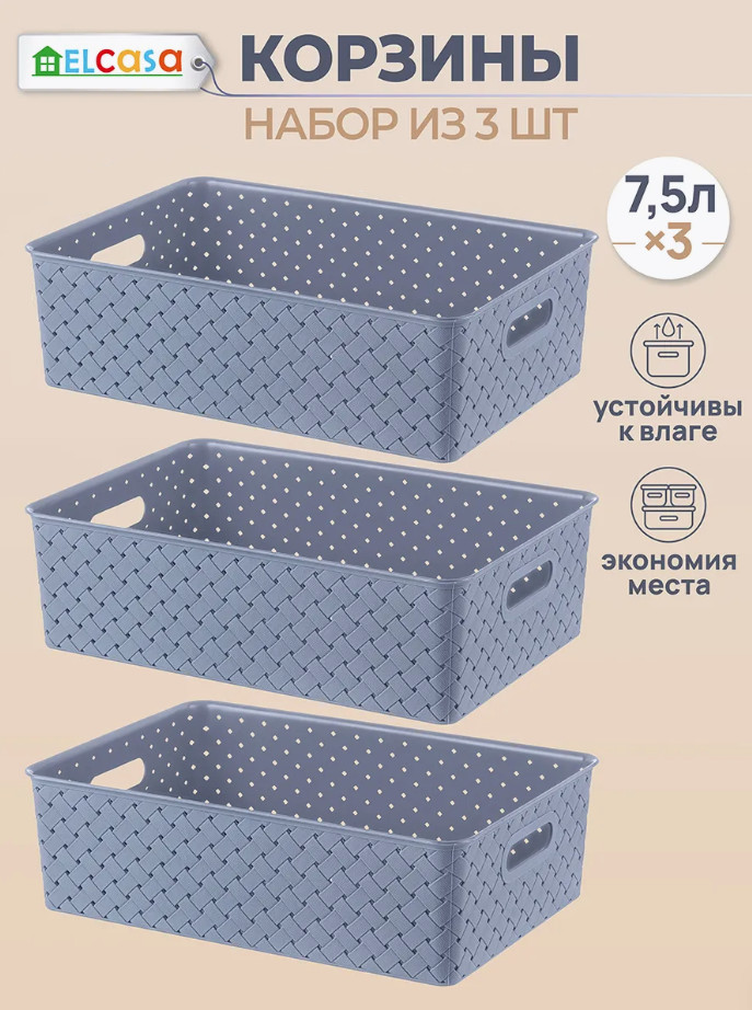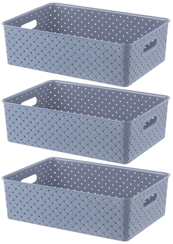состав набора EL Casa входят 3 корзинки дымчато-синего цвета объёмом по 7,5 литра (размер каждой 35×24,5×10,5 см, размер дна 32,5×21,5 см). Универсальный дизайн и благородные цвета добавят стиля вашему интерьеру. Органайзеры выполнены из полипропилена и станут незаменимыми помощниками для поддержания порядка в гардеробной, комнате или на кухне. Преимущество данного материала над обычным пластиком в том, что он лёгкий по весу и наиболее безопасный для здоровья.