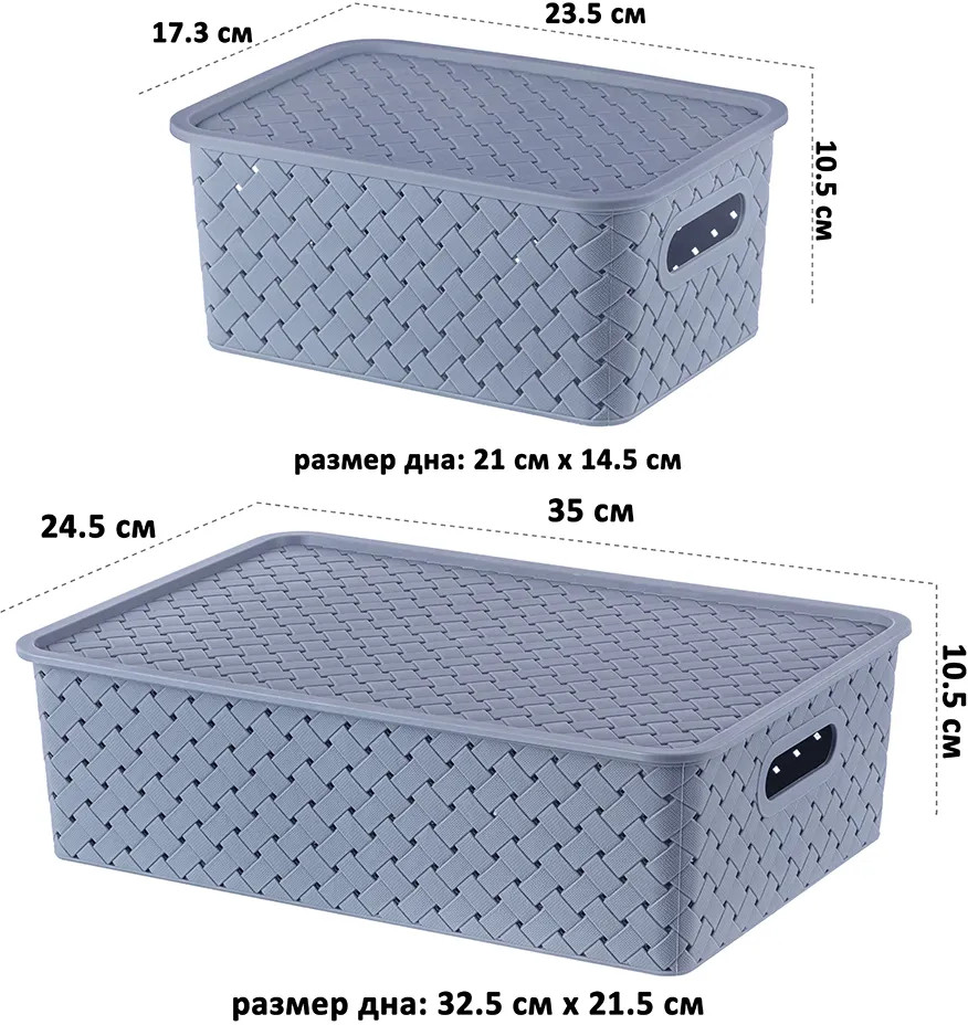 • корзинка объёмом по 3 литра (размер каждой 23,5×17,3×10,5 см, размер дна 21×14,5 см) — 2 шт.;