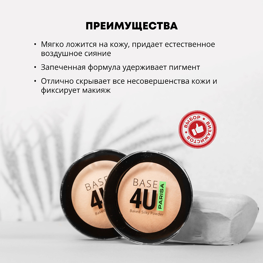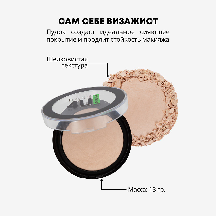 Запеченая компактная упаковка гарантирует, что вы всегда будете в шаге от идеального макияжа. Держите запеченную пудру Base 4U под рукой, чтобы корректировать макияж в любое время и в любом месте! Почувствуйте уверенность и комфорт с запеченной пудрой Base 4U от Parisa — вашим надежным союзником в создании безупречного образа!