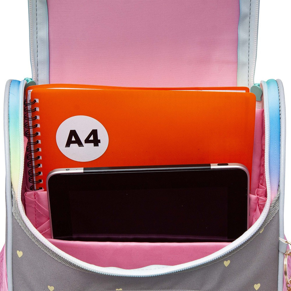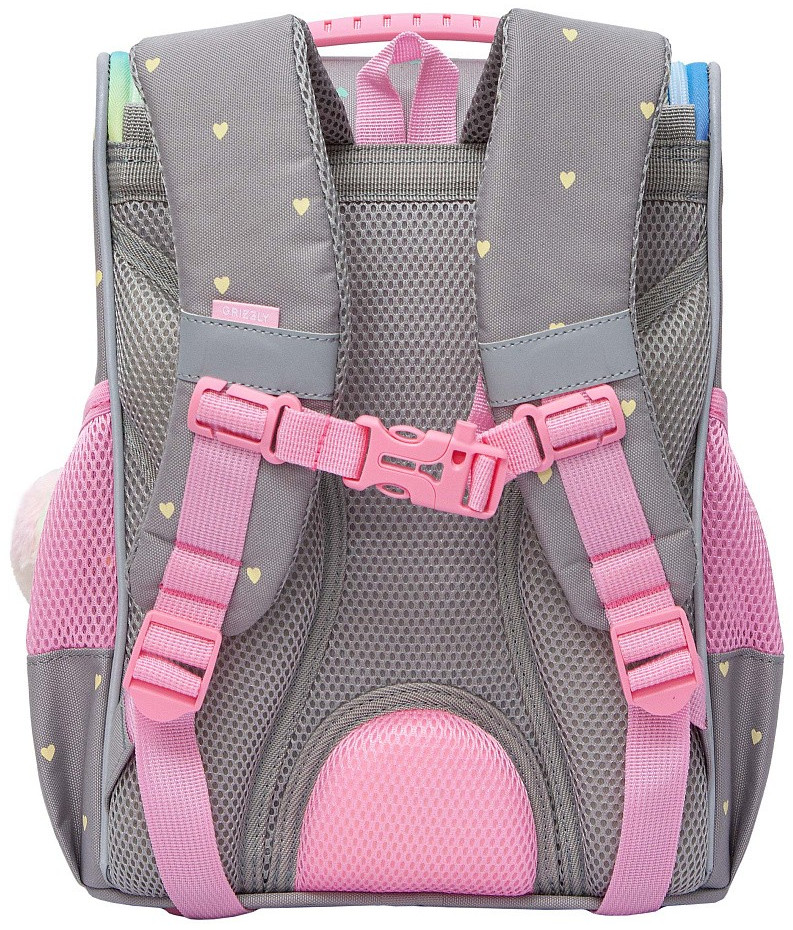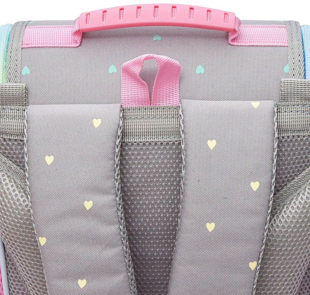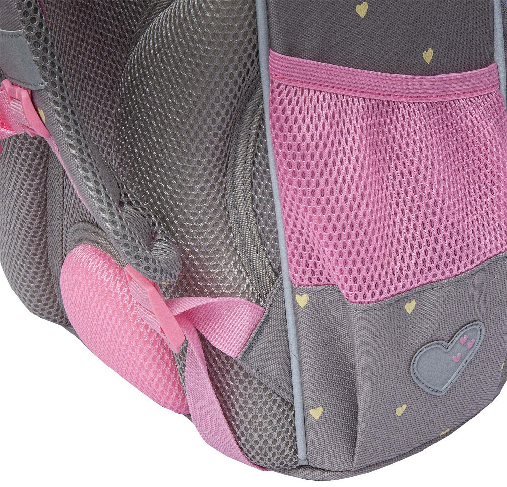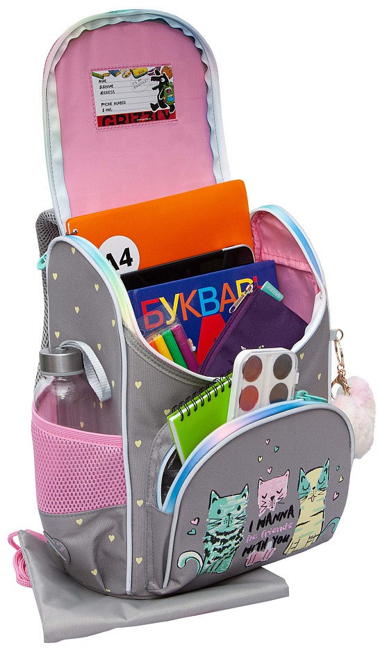У школьного портфеля одно большое отделение с разделителем для учебных пособий формата А4, все лежит на своих местах. Рюкзак широко открывается, обеспечивая легкий доступ к содержимому. У него есть фронтальный карман на молнии для разных мелочей, удобная ручка и два вместительных боковых кармана. В комплекте к детской сумке прилагается мешок для обуви. Вечером ребенка точно заметят водители, т. к. со всех сторон есть отражатели. За счет водо- и грязеотталкивающей пропитки ранец долго остается как новый. Если он все же чем-то испачкался, мы рекомендуем ручную стирку в холодной воде.