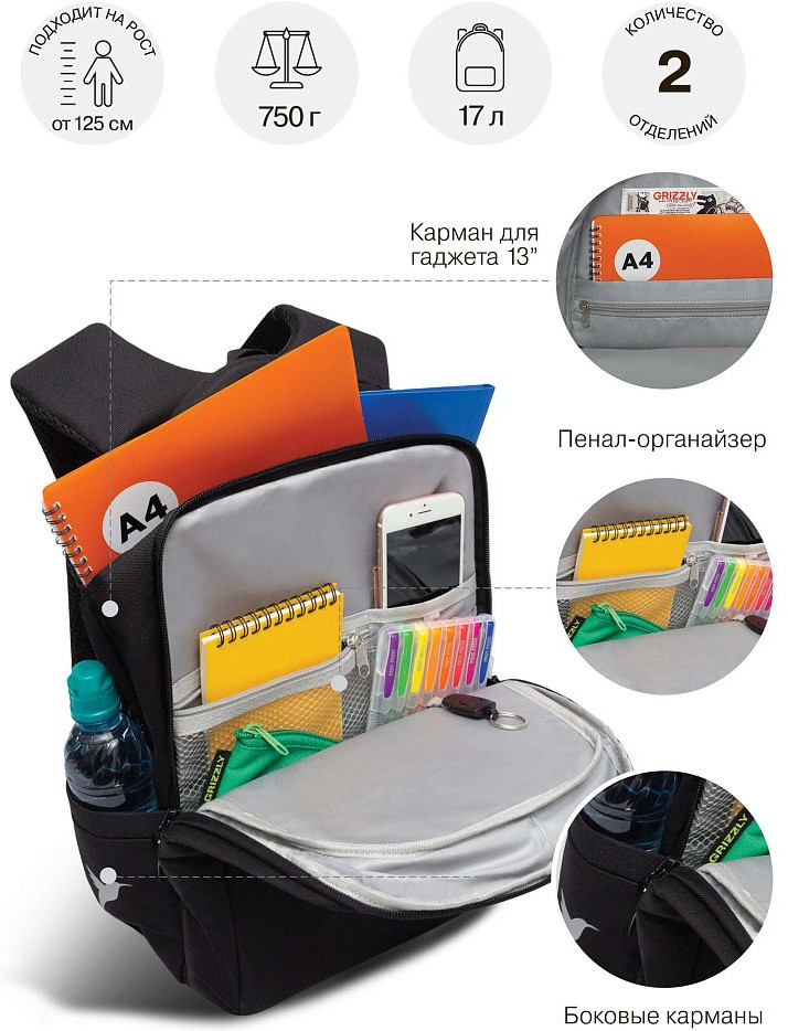 💳 Оплатить за товар можно при получении 🇰🇿 Есть бесплатная доставка по Казахстану от 1 дня 🎁 Копите бонусы с каждой покупки Анатомический рюкзак Grizzly, разработанный для школьников ростом от 125 до 140 см, помогает сохранить здоровую спину. Эта модель с откидным жестким дном выполнена из прочного плотного полиэстера, поэтому рюкзак отлично держит форму и не перекашивается. Накладки анатомической спинки поддерживают позвоночник в правильном положении — равномернее распределяется вес. Рюкзак вместительный — внутри помещается все, что может понадобиться в школе. |