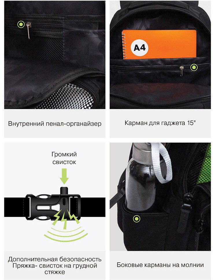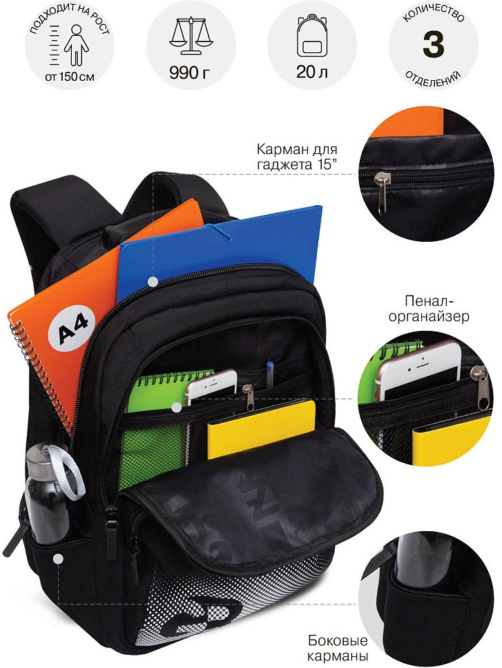 Карман на молнии на передней стенке- удобное место для хранения мелочей, которые всегда должны быть под рукой. Боковые карманы из сетки идеально подходят для бутылок с водой или мелких предметов, обеспечивая легкий доступ к ним. Откидное жесткое дно обеспечивает устойчивость рюкзака и защиту содержимого от повреждений. Внутренний составной пенал-органайзер помогает упорядочить канцелярские принадлежности и мелочи, создавая порядок в рюкзаке, держатель для ключей — позволяет быстро и удобно находить ключи, исключая их потерю. Анатомическая спинка и укрепленные лямки обеспечивают комфорт при длительном ношении и поддерживает здоровье спины. Нагрудная стяжка-фиксатор надежно фиксирует рюкзак, предотвращая его смещение во время активных движений. Укрепленная ручка позволяет удобно переносить рюкзак в руках.