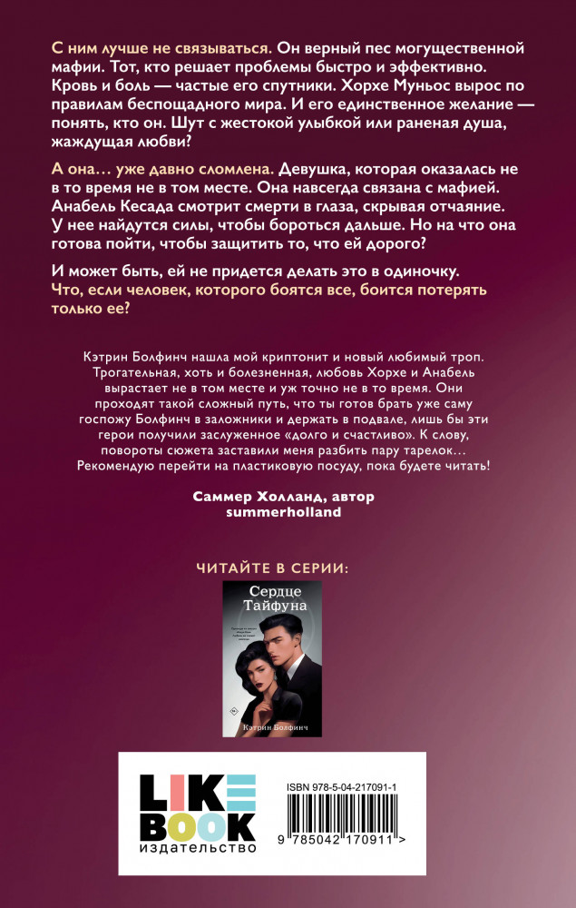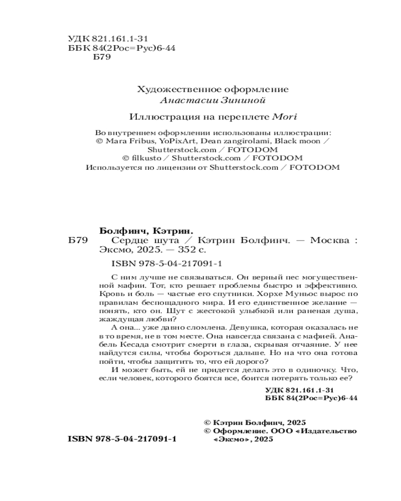 С ним лучше не связываться. Он верный пес могущественной мафии. Тот, кто решает проблемы быстро и эффективно. Кровь и боль — частые его спутники. Хорхе Муньос вырос по правилам беспощадного мира. И его единственное желание — понять, кто он. Шут с жестокой улыбкой или раненая душа, жаждущая любви? А она... уже давно сломлена. Девушка, которая оказалась не в то время не в том месте. Она навсегда связана с мафией. Анабель Кесада смотрит смерти в глаза, скрывая отчаяние. У нее найдутся силы, чтобы бороться дальше. Но на что она готова пойти, чтобы защитить то, что ей дорого? И, может быть, ей не придется делать это в одиночку. Что, если человек, которого боятся все, боится потерять только ее? |