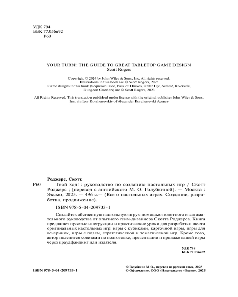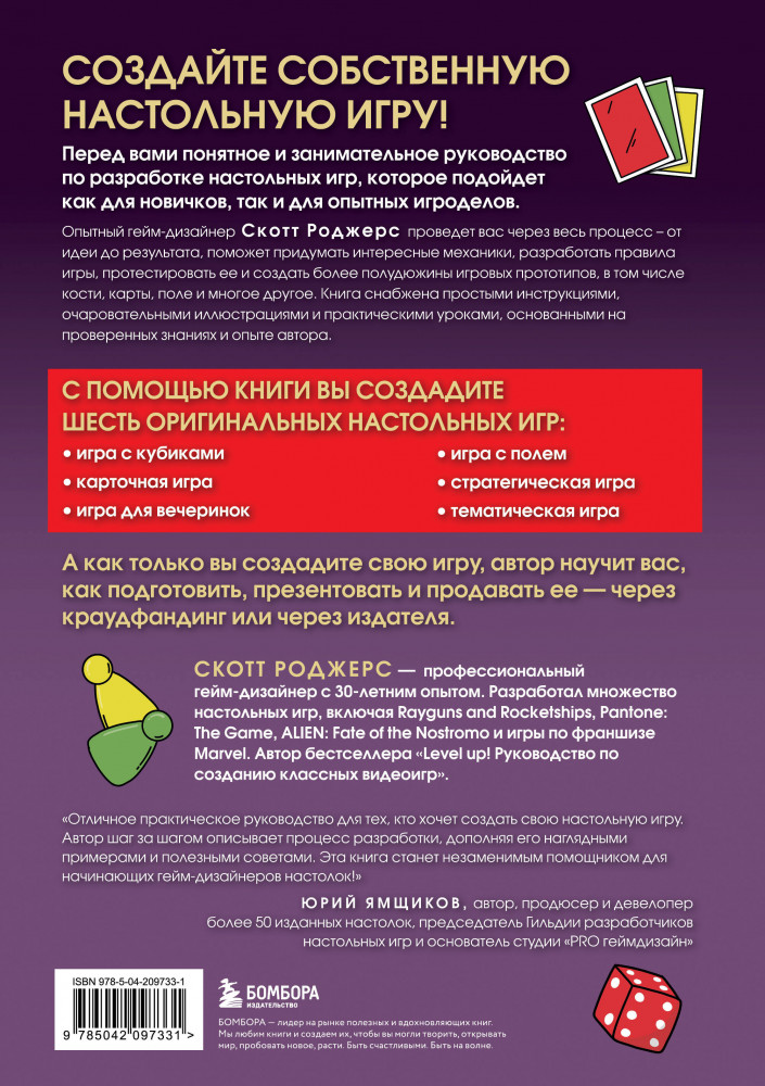 💳 Оплатить за товар можно при получении 🇰🇿 Есть бесплатная доставка по Казахстану от 1 дня 🎁 Копите бонусы с каждой покупки Серия: Все о настольных играх. Создание, разработка, продвижение Создайте собственную настольную игру! Перед вами понятное и занимательное руководство по разработке настольных игр, которое подойдет как для новичков, так и для опытных игроделов. Опытный гейм-дизайнер Скотт Роджерс проведет вас через весь процесс от идеи до результата, поможет придумать интересные механики, разработать правила игры, протестировать ее и создать более полудюжины игровых прототипов, в том числе кости, карты, поле и многое другое. Книга снабжена простыми инструкциями, очаровательными иллюстрациями и практическими уроками, основанными на проверенных знаниях и опыте автора. |