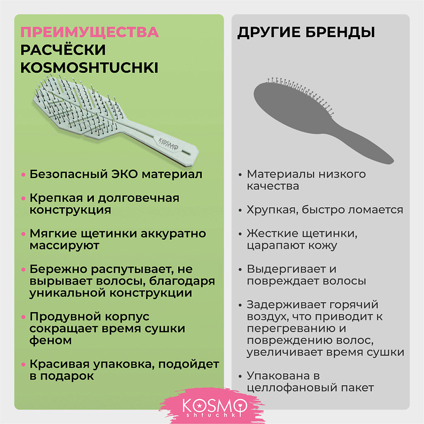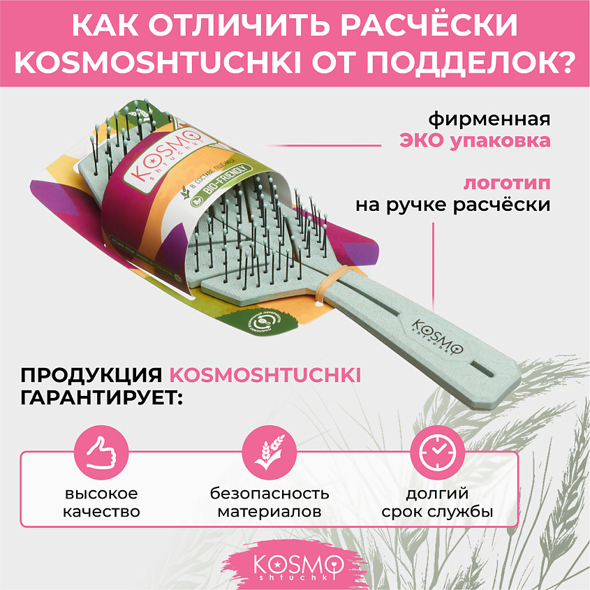| «KosmoShtuchki» — это не только качество, но и доступность, и стиль. Миссия бренда заключается в том, чтобы женщины выглядели красиво снаружи и чувствовали себя также хорошо внутри. На сегодняшний день в ассортимент бренда «KosmoShtuchki» входят спонжи для нанесения макияжа, широкая линейка косметичек, ватные палочки и ЭКО-расчески. |
