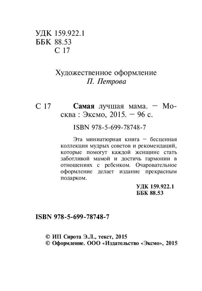 Самая лучшая мамаВ данный момент этот товар отсутствует в продаже. Возможно, у нас найдется аналогичный или похожий товар здесь. Серия: Подарочные издания. Психология Эта миниатюрная книга - бесценная коллекция мудрых советов и рекомендаций, которые помогут каждой женщине стать заботливой мамой и достичь гармонии в отношениях с ребенком. Очаровательное оформление делает издание прекрасным подарком. |