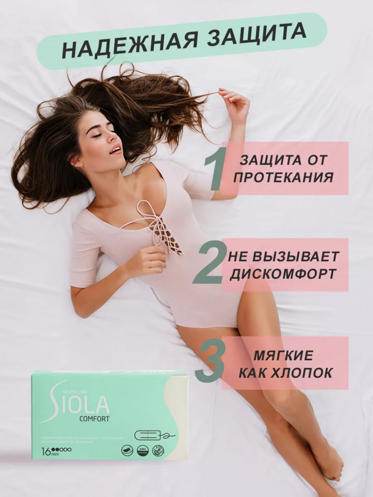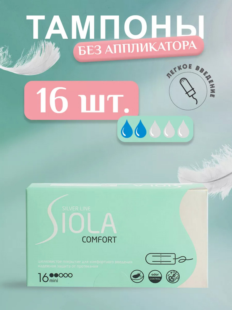Тампоны Siola Siver имеют шелковистое покрытие для комфортного введения, надежно защищают от протекания. Безаппликаторные тампоны Siola Silver подарят надежную защиту и комфорт без неприятных ощущений. Каждый тампон имеет индивидуальную защитную пленку. Закругленный кончик и гладкое шелковистое покрытие обеспечивают безопасное и безболезненное введение. Компактная упаковка с легкостью поместится в косметичку и позаботятся о тебе даже в дороге и путешествиях.Тампоны Siola Siver mini предназначены для небольших выделений во время менструации.