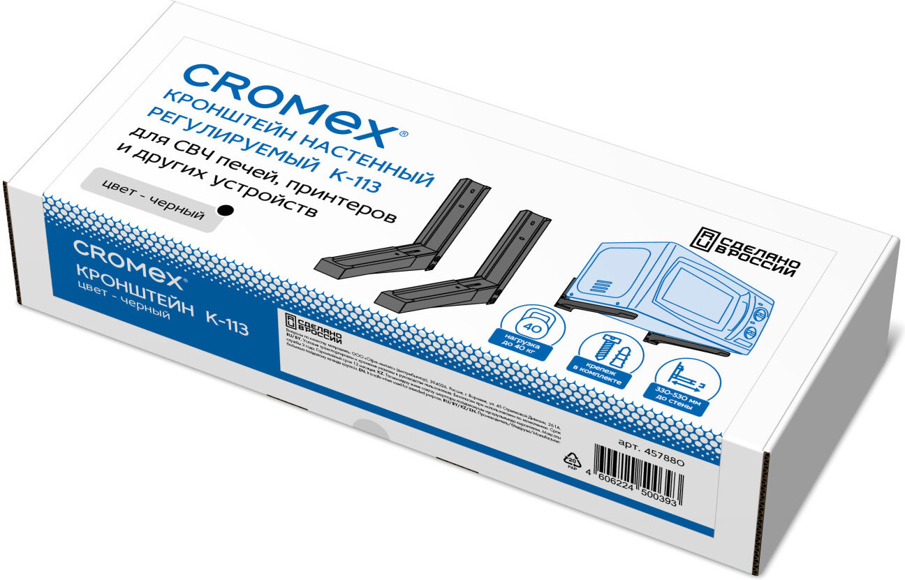 💳 Оплатить за товар можно при получении 🇰🇿 Есть бесплатная доставка по Казахстану от 1 дня 🎁 Копите бонусы с каждой покупки Серия: K-11 Настенный кронштейн — удобный способ организации пространства, который порадует надежностью, универсальностью и простотой использования. Cromex K-113 выдерживает нагрузку до 40 кг. Благодаря раздвижной конструкции опорной части, длина кронштейна регулируется в диапазоне от 33 до 53 см. Хотите удобно организовать пространство дома или в офисе? С надежным и функциональным кронштейном это сделать легко! |