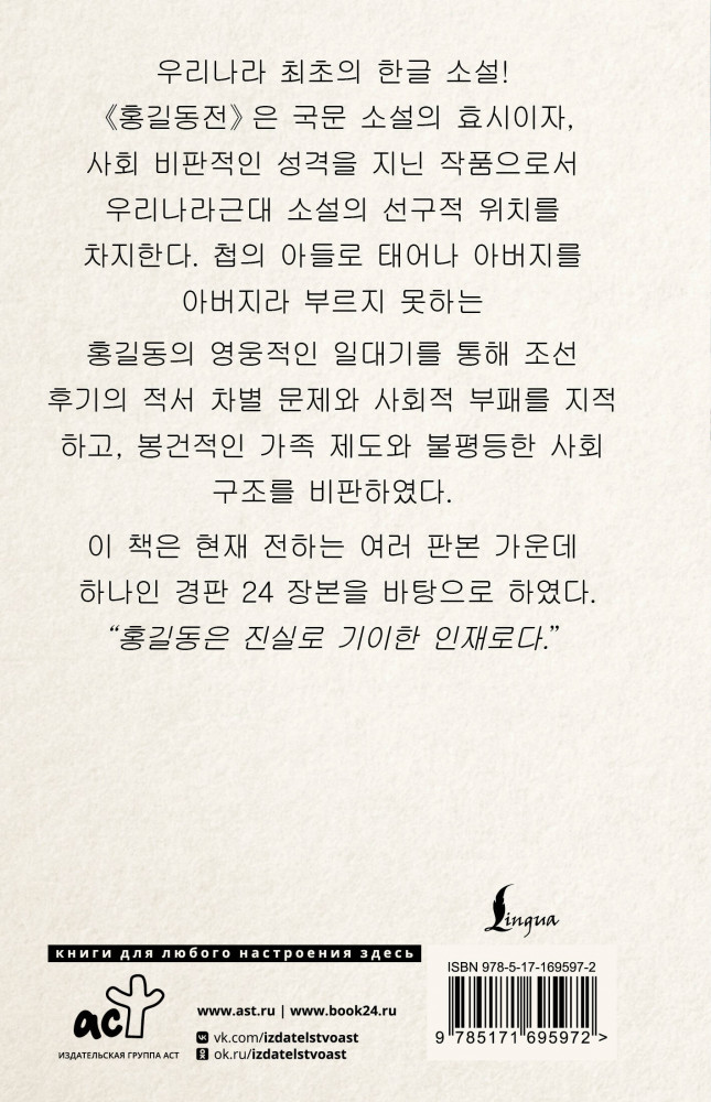 Hong Gildong Jeon. Сказание о Хон ГильдонеВ данный момент этот товар отсутствует в продаже. Возможно, у нас найдется аналогичный или похожий товар здесь. Серия: Эксклюзивная классика Востока (тв) «Сказание о Хон Гильдоне», также известное как «Повесть о Хон Гильдоне» — это не просто первый роман, написанный на корейском языке, а великое остросоциальное произведение, которое стало предвестником корейской художественной прозы нового времени — прозы, обращённой к народу. Через историю Хон Гильдона — юноши, рождённого от наложницы и не имеющего права называть своего отца «отцом», — автор обнажает язвы позднечосонского общества: классовое неравенство, разложение власти, лицемерие феодального семейного уклада. |