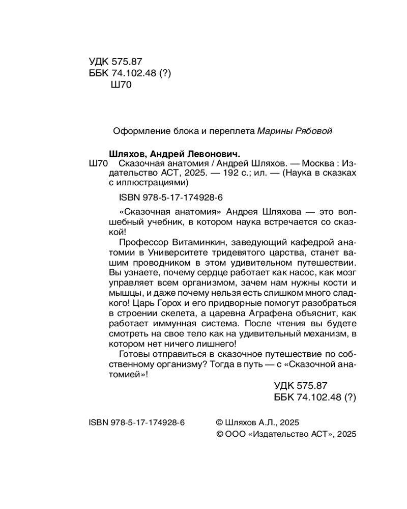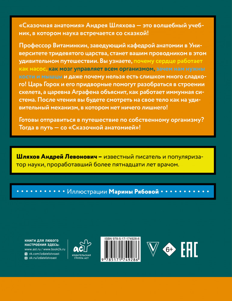 💳 Оплатить за товар можно при получении 🇰🇿 Есть бесплатная доставка по Казахстану от 1 дня 🎁 Копите бонусы с каждой покупки Серия: Наука в сказках с иллюстрациями Сказочная анатомия Андрея Шляхова — это волшебный учебник, в котором наука встречается со сказкой!Профессор Витаминкин, заведующий кафедрой анатомии в Университете тридевятого царства, станет вашим проводником в этомьудивительном путешествии. Вы узнаете, почему сердце работает как насос, как мозг управляет всем организмом, зачем нам нужны кости и мышцы и даже почему нельзя есть слишком много сладкого! Царь Горох и его придворные помогут разобраться в строении скелета, а царевна Аграфена объяснит, как работает иммунная система. После чтения вы будете смотреть на свое тело как на удивительный механизм, в котором нет ничего лишнего! Готовы отправиться в путешествие по собственному организму? Тогда в путь — со «Сказочной анатомией»! |