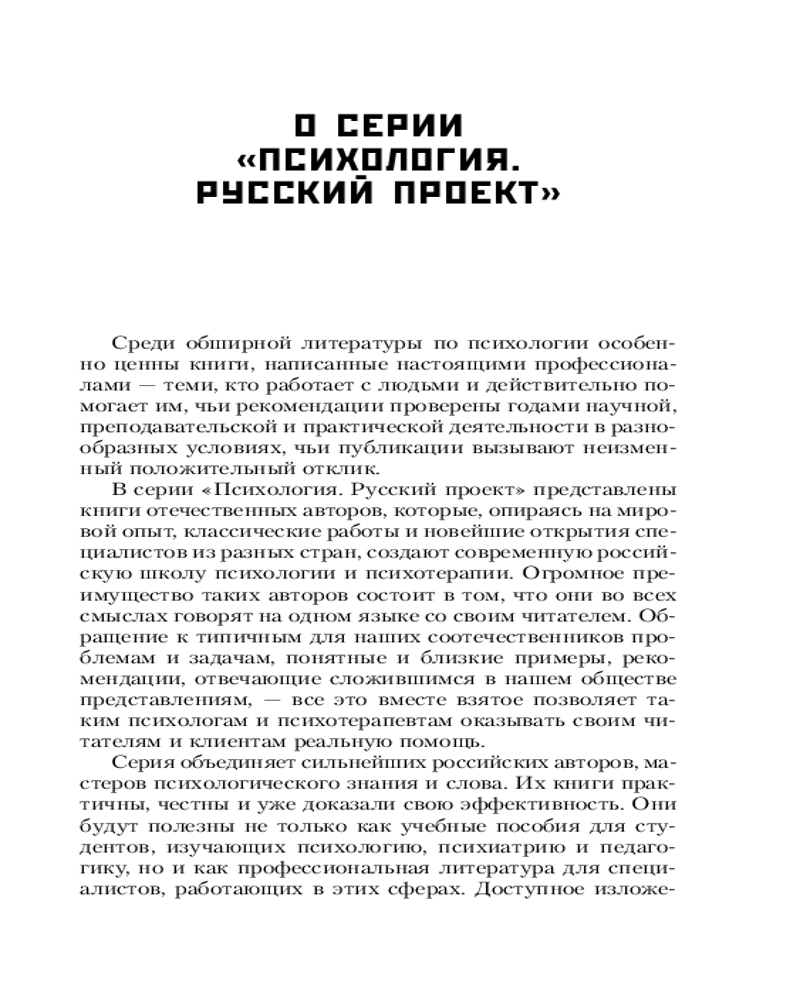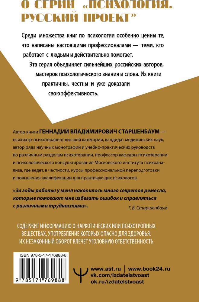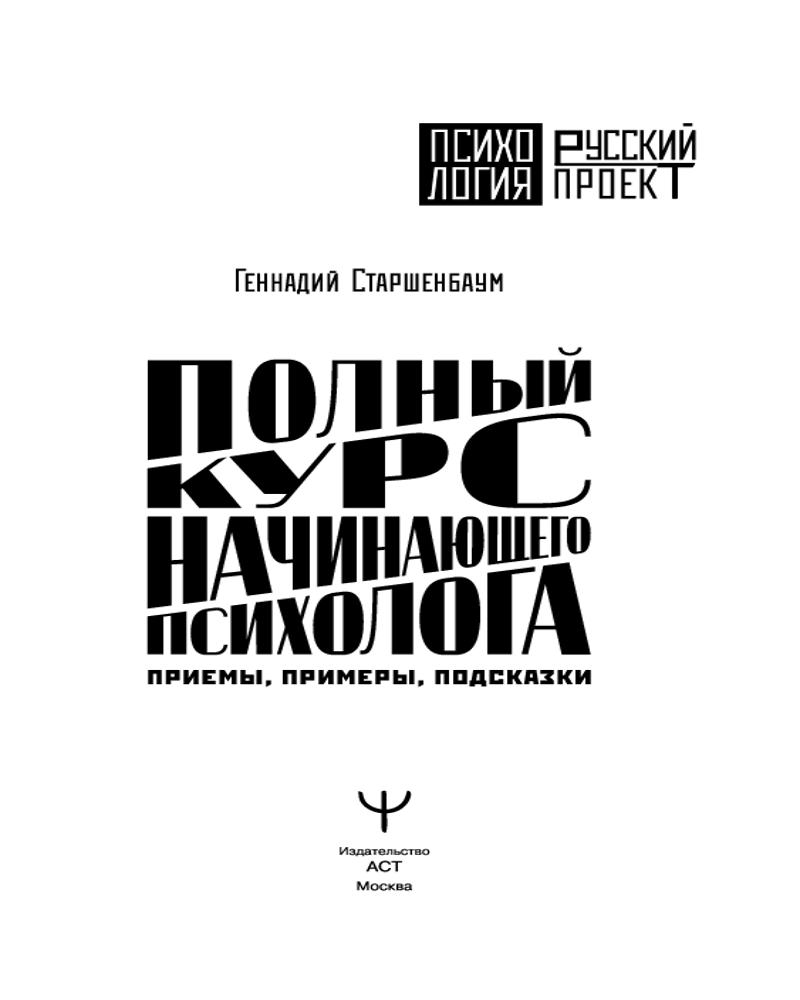 Серия: Психология. Русский проект Книга-легенда «Полный курс начинающего психолога» Геннадия Владимировича Старшенбаума — известного психолога-практика и психотерапевта с полувековым профессиональным стажем, полезна не только начинающим специалистам, но и читателям, желающим расширить свой кругозор.