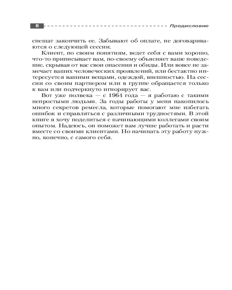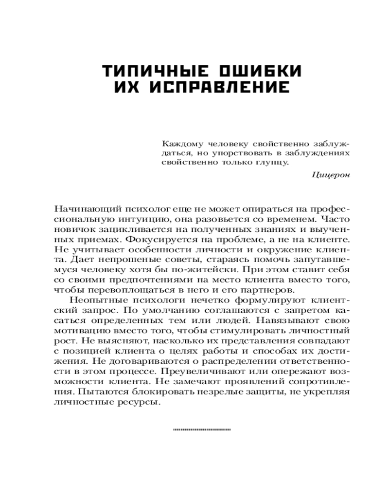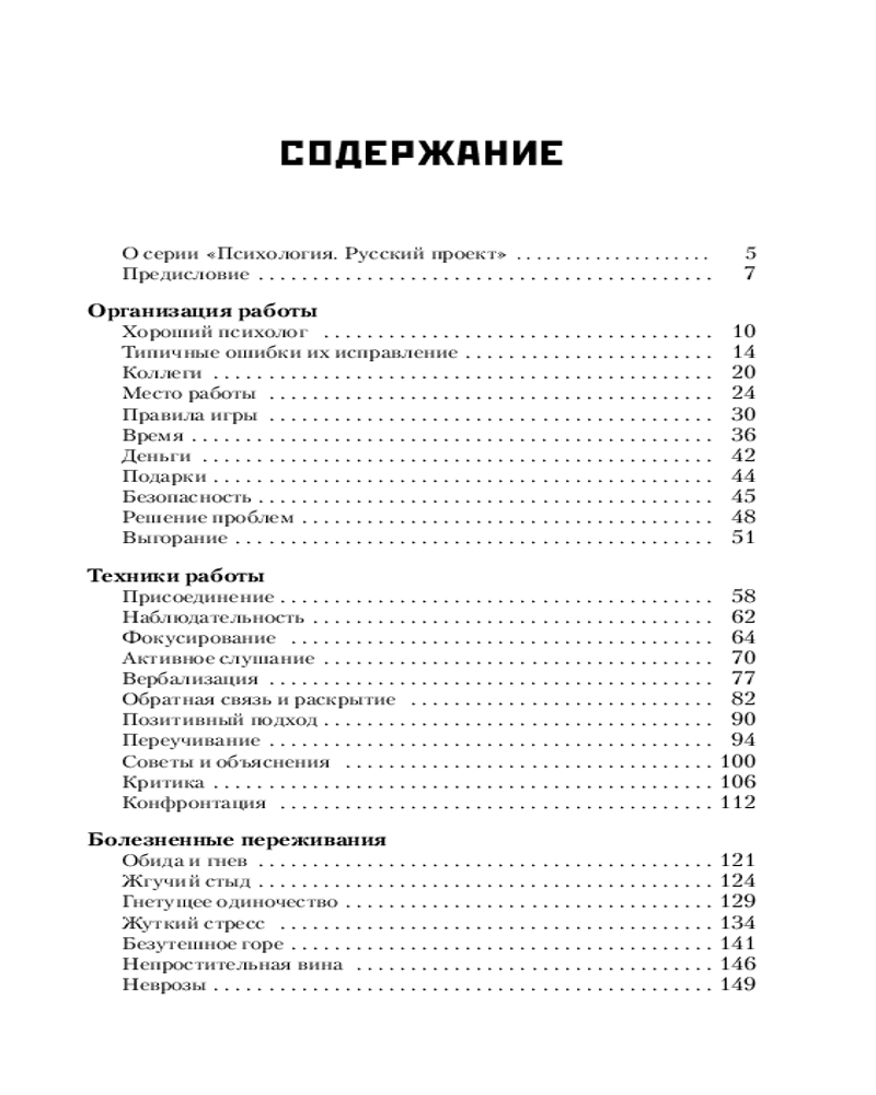 Подробно описывается, как организовать прием клиентов, детально рассматриваются эффективные формы и методы работы с людьми разного возраста и пола при индивидуальной и групповой терапии. В тексте учитываются не только проблемы потенциального клиента, но и его личностные особенности, позиция в терапевтических отношениях и влияние окружения. Анализируются типичные ошибки начинающего психолога и указывается, как их избежать.