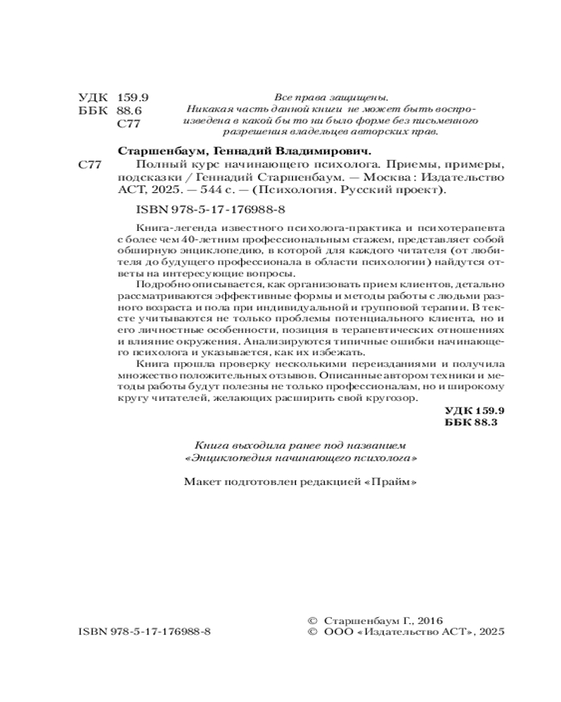 Книга-легенда «Полный курс начинающего психолога» Геннадия Владимировича Старшенбаума — известного психолога-практика и психотерапевта с полувековым профессиональным стажем, полезна не только начинающим специалистам, но и читателям, желающим расширить свой кругозор.