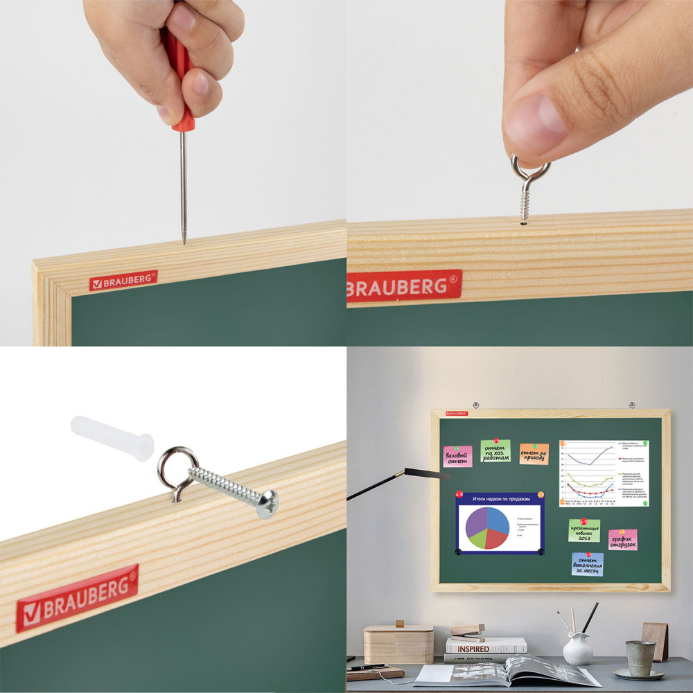 Магнитная доска для письма мелом Brauberg находит широкое применение в учебных заведениях. Металлическая поверхность позволяет размещать информацию при помощи магнитов. Лаковое покрытие предназначено для письма мелом или специальными меловыми маркерами, а металлическая поверхность позволяет размещать информацию при помощи магнитов. Задняя часть доски дополнительно усилена оцинкованным листом. Деревянная рамка из сосны. Перед первой установкой шурупа-кольца в раму необходимо сделать отверстие шилом для более легкого вкручивания.