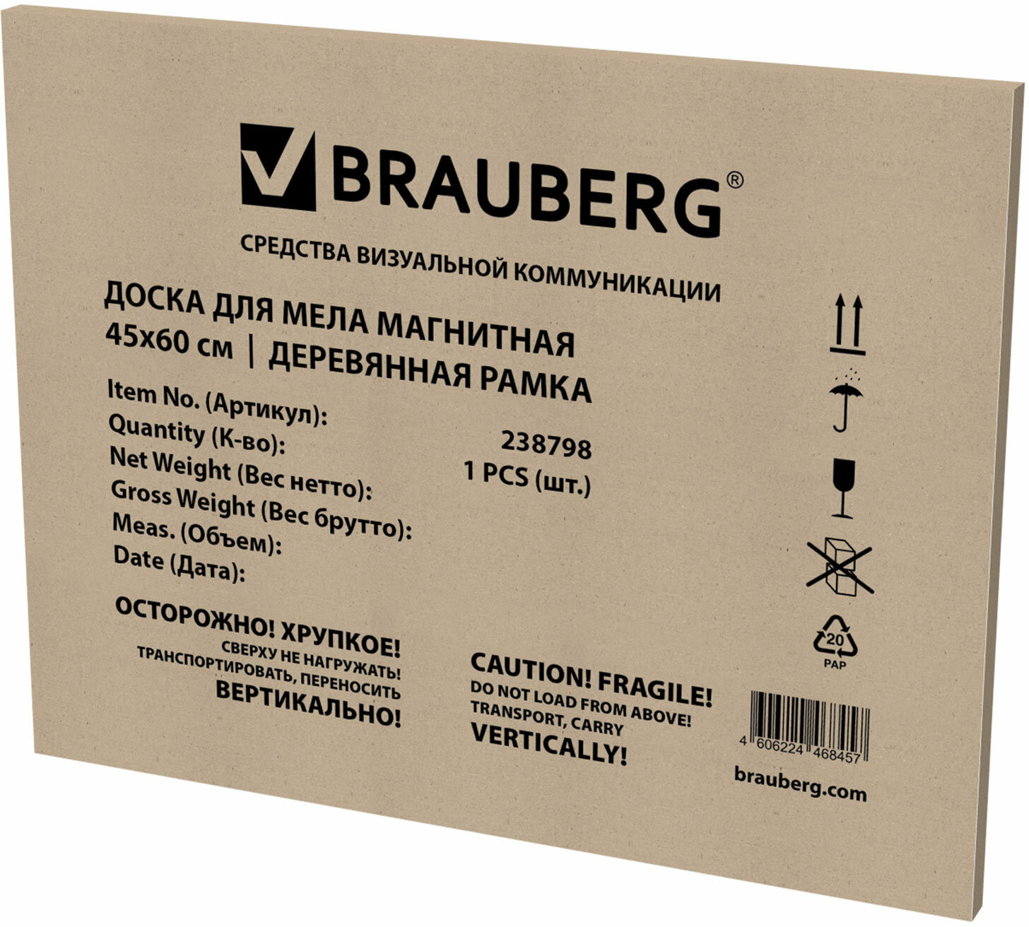 Размер доски — 45×60 см. Есть возможность горизонтального и вертикального крепления. Набор креплений для доски в комплекте. Надежная упаковка — термоусадочная пленка и гофрированный короб с усиленными прокладками. Приобретите магнитную доску для мела Brauberg и повысьте эффективность своей работы! Улучшите командное взаимодействие, облегчите процесс принятия решений и организуйте свое рабочее пространство.
