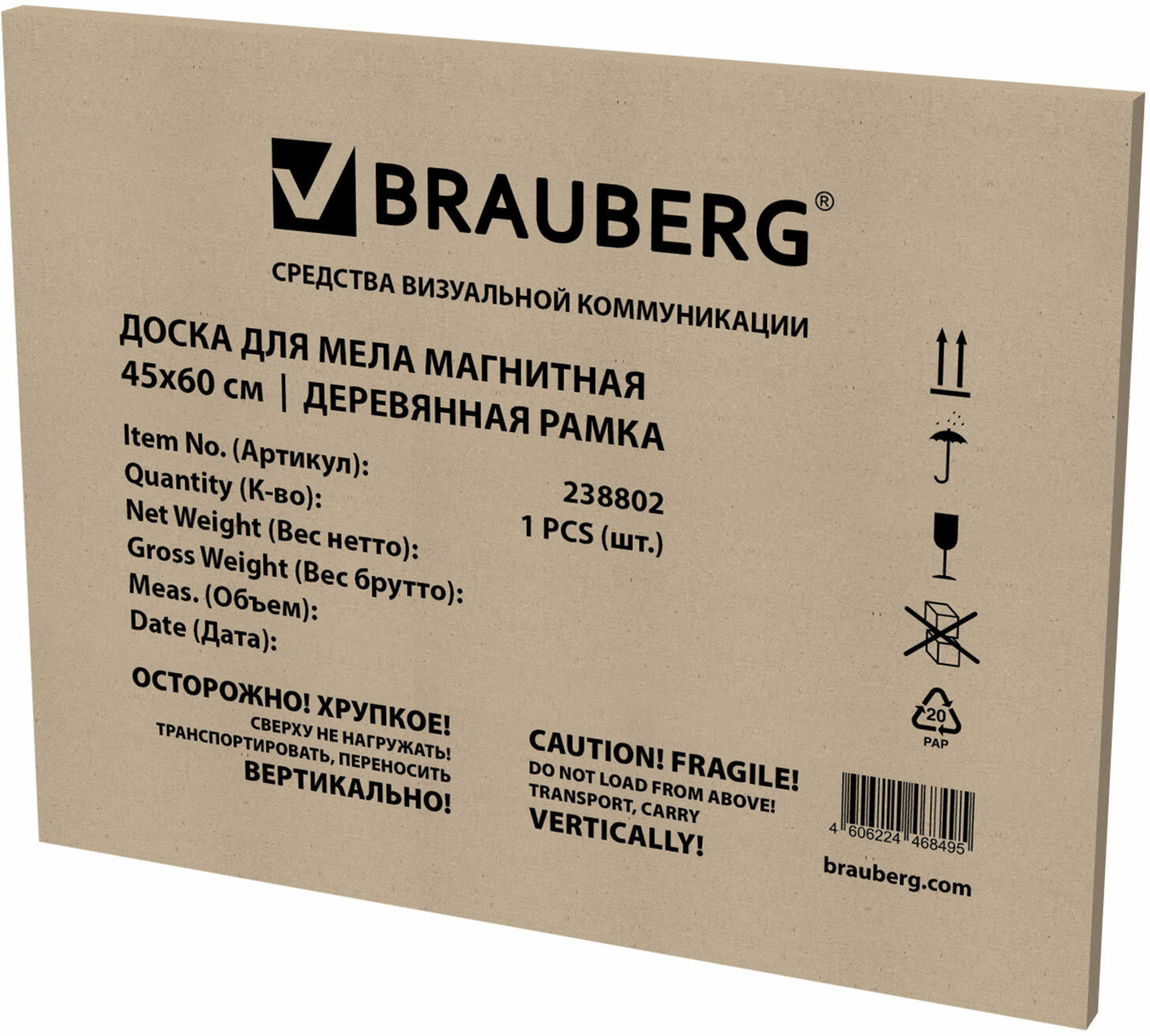 Размер доски — 45×60 см. Есть возможность горизонтального и вертикального крепления. Набор креплений для доски в комплекте. Надежная упаковка — термоусадочная пленка и гофрированный короб с усиленными прокладками. Приобретите магнитную доску для мела Brauberg и повысьте эффективность своей работы! Улучшите командное взаимодействие, облегчите процесс принятия решений и организуйте свое рабочее пространство.