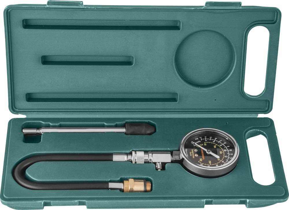 Прибор для диагностики работоспособности и обнаружения неисправностей цилиндро-поршневой группы и газораспределительного механизма бензиновых двигателей внутреннего сгорания. Изделие комплектуется 64-миллиметровым манометром, имеющем шкалы градуировки до 21 кгс/см² в различных величинах: psi, Bar, кгс/см², ниппельной насадкой, длиной 150 мм, гибким шлангом, длиной 325 мм с двумя резьбовыми адаптерами для свечных отверстий М14 и М18. Прибор используется для диагностики двигателей с осложненным доступом к свечным отверстиям и двухвальных двигателей, с расположением свечных отверстий в "колодцах"