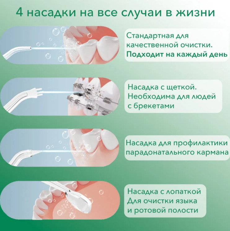 Ирригатор «Tooth smile»В данный момент этот товар отсутствует в продаже. Возможно, у нас найдется аналогичный или похожий товар здесь. Ирригатор — идеальный помощник для безупречной улыбки. Глубокая очистка — пульсации воды до 1400 импульсов/мин удаляют до 99% налёта там, где не справляется зубная нить. Три режима работы — Normal для ежедневной гигиены, Soft для чувствительных дёсен, Pulse для массажа и усиленного промывания. Большой резервуар 300мл — хватает на полноценную процедуру без дозаправки. |