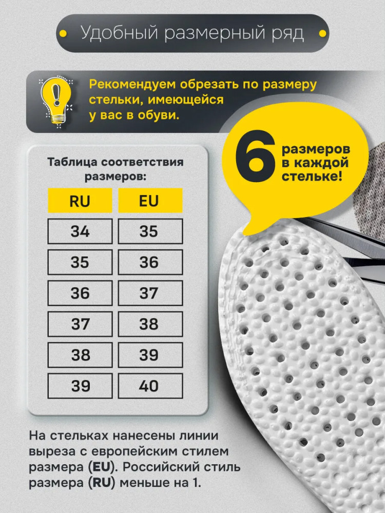 Стельки для обуви Shegra анатомические дышащие отлично подойдут для любой обуви, обеспечат комфорт при ходьбе и оптимальный микроклимат. Стельки для обуви с европейским размером EU 35-40, что соответствует российскому размеру RU 34-39. На стельках указан европейский стандарт размера EU, а также нанесены линии выреза. Для удобства на упаковке приведена таблица соответствия размеров RU/EU. Стельки выполнены из инновационного полиуретанового материала, который имеет структуру микропор, заполненных воздухом, что обеспечивает поглощение ударных нагрузок, водонепроницаемость и износостойкость, снижает нагрузку на опорно-двигательный аппарат. Оснащены влаговпитывающим покрытием и перфорацией для циркуляции воздуха, что способствует нормализации микроклимата у вас в обуви.